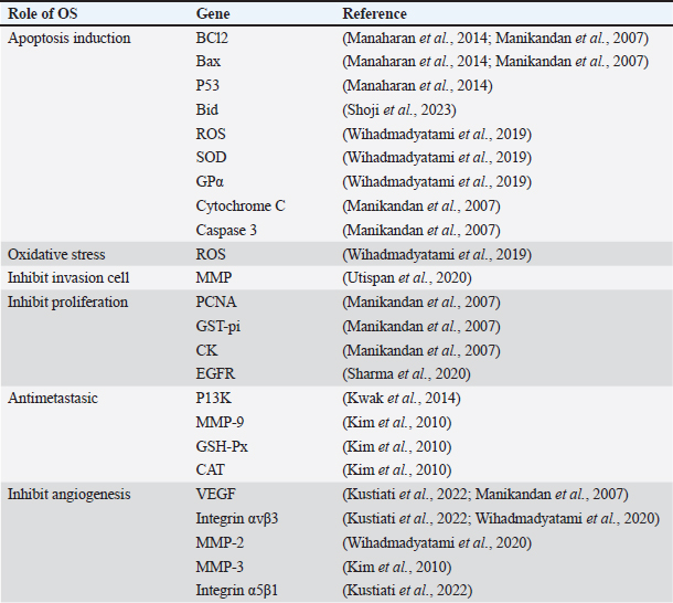 OS leaves, seeds, stems, fruits, flowers, and roots are almost all used as extracts or medications in traditional herbal remedies. However, in Indonesia, the leaves are the most commonly used herb in medicine, followed by the seeds, aerial parts, and entire plants. Similar to previous worldwide ethnobotanical studies conducted in Ghana, Lebanon, Morocco, and Turkey, an ethnobotanical reference study found that leaves were the main dominant plant component used in the composition of traditional treatments. Several studies have been carried out to comprehend OS’s impact on cancer. Ethanol extract of OS (EEOS) has been studied in vivo and in vitro for its anticancer properties. To determine the molecular target of EEOS, a study was carried out on a rat model of MNN-induced stomach carcinogenesis. As genes that promote proliferation and angiogenesis, the study found that eugenol, ursolic acid, and carvacrol extracted from the OS leaf were able to lower the expression of PCNA, GST-pi, BCl-2, CK, and VEGF in rats with stomach carcinogenesis caused by MNN. According to this discovery, substances also raise the expression of apoptosis-inducing genes such as caspase 3, cytochrome C, and Bax (Manikandan et al., 2007). The study also revealed that the expression of EGFR, Kelch-like ECH-associated protein 1 (KEAP1), and β2- adrenergic receptor (β2-AR) was successfully inhibited by quercetin, rutin, and tannic acid that were separated from defatted OS seed extract. The G protein-coupled receptors, which are seven transmembrane receptors, including the β2-AR, are involved in the development and spread of oral cancer. It was discovered that norepinephrine-stimulated β2-AR enhanced IL-6 production and cell proliferation in oral squamous cell carcinoma cell lines (Sharma et al., 2020). The lung is one of the tissues with high levels of NRF2 expression where detoxifying processes take place. It interacts with KEAP1, its own negative regulator, under normal physiological settings. The oxidative stress sensor KEAP1 mediates Nrf2 degradation (Bauer et al., 2013). According to research on an A549 human lung cancer cell, EEOS raises TUNEL 1 positive and the apoptotic sub-G1 in A549 cells, suggesting that enough DNA has been ruined by DNA fragmentation. According to a different study, EEOS’s polyphenols and flavonoids cause A549 cells to separate from the ECM, which lowers the cells’ viability. Furthermore, the capacity of EEOS to induce apoptosis raises the quantity of intracellular reactive oxygen species (ROS) and the interference activity of superoxide dismutase (SOD) and GPα (Fig. 5) (Wihadmadyatami et al., 2019). In A549 cells, angiogenesis is inhibited by downregulating integrin αvβ3, a5b1, MMP-2, and MMP-9 (Wihadmadyatami et al., 2020; Kustiati et al., 2022). The anti-metastasis action of EEOS was demonstrated to be mediated by inhibition of phosphatidylinositide 3-kinase (P13K) in research conducted on NCI-H460 NSCLC cells (Kwak et al., 2014). According to Utispan et al. (2019), rosmarinic acid in the extract of EEOS may reduce the activity of MP after preventing cell invasion (Utispan et al., 2020) (Fig. 5). The (-)-rabdosiin of EEOS has been shown to stimulate antiproliferation in human cancer cell lines in another investigation (Flegkas et al., 2019). Applying EEOS to human breast cancer cells has the potential to increase the expression of P53 and Bid (BH3 interacting domain death agonist) as well as the Bax/Bcl2 protein ratio (Manaharan et al., 2013). Singhal et al. (2017) reported that vicenin-2, a flavonoid derived from tulsi (holy basil), inhibits the proliferation of prostate cancer (CaP) and increases the antitumor properties of docetaxel in vitro and in vivo when compared to other active substances of OS Linn, such as erientin and luteolin. Vicenin-2 raises p53 levels, decreases hTERT, PCNA, and pRB, and suppresses pEGFR, pAkt, and the mTOR signaling mediator Pp70S6K (Singhal et al., 2017). Inducing apoptosis, preventing cell invasion, limiting proliferation, restricting metastasis, and inhibiting angiogenesis are among the functions of OS in lung cancer (Fig. 5). Multiple investigations have indicated that OS’s ability to fight cancer is significantly influenced by intrinsic mitochondrial apoptosis. Cytochrome C is released into the cytosol when mitochondrial malfunction brought on by the cleavage of Bid by the intrinsic apoptosis pathway triggers apoptosis. Apoptotic protease activating factor-1, or Apaf1, is an adaptor protein that is activated when cytochrome C in the cytosol attaches to procaspase. This process creates the apoptosome, which in turn attracts procaspase 9. Apoptosis is brought on by the activation of caspase-9 and caspase-3, which causes cell death and DNA fragmentation, among other apoptotic hallmarks (Manaharan et al., 2013, Manaharan et al., 2014; Wihadmadyatami et al., 2019, 2020). Table 4 provides a summary of the OS’s function. Table 4. The role of OS ethanolic extract to prevent cancer metastasis.