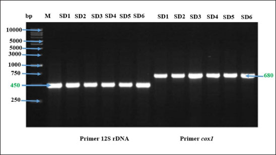 Molecular identification of Setaria spp. wormDNA extractionThe DNA extraction from samples Setaria worm in Aceh cow was conducted using a DNA extraction kit. The procedure started by combining 200 mg of the sample with 320 µl of lysis buffer, 16 µl of RNase A, 16 µl of proteinase K, and 3.2 µl of DTT in a 2 ml tube. The mixture was incubated at 65°C for 1 hour. After incubation, the sample was centrifuged at 16,099 × g for 11 minutes. Following this, 320 µl of binding buffer was added, and the mixture was vortexed and incubated again at 65°C for 10 minutes. The incubated mixture was then rinsed with 320 µl of 100% ethanol, 500 µl of wash buffer, and 500 µl of 75% ethanol. Finally, the DNA was eluted in 100 µl of elution buffer at 65°C. The primer characteristic used in this research is presented in Table 1. Phylogenetic analysisPolymerase chain reaction products of cox1 and 12s rDNA were purified using Gel recovery kit (Vivantis, Malaysia) and sequenced on both strands using Big Dye Terminator V.3.1 Cycle Sequencing kit in an ABI 3130 Genetic Analyzer (Applied Biosystems, USA). Sequences were aligned together using ClustalW software (Chowdhury and Garai, 2017) to determine the consensus sequences. Consensus 12S rDNA and cox1 sequences were subjected to BLASTn analysis (http://blast.ncbi.nlm.nih.gov) and compared to all nucleotide sequences of Setaria species available in the current databases. Sequence identities (in %) were calculated by pairwise comparisons. Subsequently, the consensus sequences were aligned with a selected subset of closely related sequences of the genus Setaria. Phylogenetic relationships were inferred based on analyses employing the Neighbor-Joining (NJ) method using MEGA7. The topological stability of the tree was evaluated by 1000 bootstrap replications. Analysis dataData are presented in the form of figure and table, and then data obtained are analyzed descriptively. Ethical approvalThe experimental protocol was approved by the Animal Care and Use Committee of Faculty Veterinary Medicine, Syiah Kuala University No. 2.KEH.080.07.2023. ResultsSetaria sp. microfilaria detection in Aceh cow using Knott TestThe blood were taken from 124 Aceh cows slaughtered in Banda Aceh and Bireun Slaughterhouse, Aceh to detect Setaria sp. microfilaria using Microhematocrit Centrifugation Technique (MHCT) (Rafee and Amarpal, 2016). The results can be seen in Figure 1 and Table 2. Identification of adult Setaria sp. in Aceh cowThe observation of adult Setaria sp. from 124 cows slaughtered in Banda Aceh and Bireuen, Aceh, through direct observation could be seen in Figure 2 and Table 3 below. Identification result of adult S. digitata worm by using three staining solution to evaluate their morphology can be seen in Figure 3 below. The molecular identification of Setaria spp. wormThe DNA amplification result of Setaria spp from Banda Aceh and Bireuen slaughterhouse used the forward and reverse primer for cox1 and the forward and reverse primer for 12S rDNA with master mix PCR Go Tag which specifically attached to the template samples SD1, SD2, SD3, SD4, SD5 and SD6 then produced 450 bp for 12S rDNA and 680 bp for cox1 (Fig. 4). The 12S rRNA gene analysis result of Setaria. spThe Blast result of 12S rRNA gene nucleotide from Setaria sp. worm samples from Aceh cows (Fig. 5). The genetic distance tableThe genetic distance of S. digitata found in Aceh cow with those data from GenBank is presented in Table 4. Phylogenetic tree analysis based on COX 1 geneThe phylogenetic tree analysis result for COX 1 gene of S. digitata seen on Figure 6. The phylogenetic analysis result 450 bp, with maximum parsimony method in Mega program version 11.0, and Kimura 2 parameter 1,000× bootstraps showed that the Setaria worm samples from this research are still grouped as S. digitata, although it has different clade with other comparison isolates from the genbank sequence data. The Setaria genus in this research formed two groups, which are the S. digitata and Setaria labiatopapilosa group. The S. digitata group is divided into three groups where the S. digitata worm in this research is within their own group along with S. digitata isolate from China, different from other S. digitata and from Dirofilaria and Wucheria worms as the out-group representatives. DiscussionTable 2 revealed that Setaria sp. incidence rate in Aceh cow was 12.7%. This is lower compared to the result from Sundar and D’Souza (2013) who reported the prevalence of Setaria sp. in cows in India ranged between 77% and 95% with 187 out of 500 livestock samples found positive for Setaria sp. However, This result is lower compared to the incidence rate observed by Rodrigues et al. (2021) who reported that 136 nematodes found in cows and water buffaloes in Brazil with the prevalence rates were 24% and 25%, respectively. Based on the results, it indicated that for livestock in the Aceh area the cases are still low, but attention needs to be given to eliminate the Setariosis cases in livestock and to broad the treatment coverage beyond anthelmintic drugs. Table 1. The PCR condition and primer sequences for tandem repeat DNA, cox1 and 12Sr.