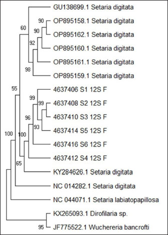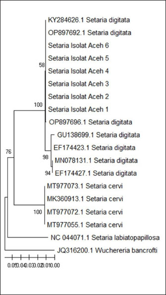 Fig. 7. The phylogenetic tree analysis result of 12S rDNA gene. The phylogenetic tree analysis result of 12S rDNA gene is shown in Figure 7. The phylogenetic analysis result 680 bp, using the maximum parsimony method in Mega Program version 11.0, with Kimura 2 parameter model with 1,000× bootstrap, showed that the Setaria worm sample of this research is still grouped S. digitata species, despite having different similarity level with other isolates taken from genebank as a comparison. The Setaria genus in this research formed two groups, which are the S. digitata and S. labiatopapilosa group. The S. digitata group is divided into two big groups, the S. digitata and Setaria cervi group. The S. digitata worm in this research is in its own group with S. digitata isolates from China and Thailand, different from other S. digitata which are isolates from Sri Lanka and India as well as with Wucheria worm as an out-group representative. The phylogenetic analysis of S. digitata based on COX 1 gene and 12 S rDNA gene has showed the isolate and sequence from different host species has produced separate clade with high bootstrap support in Setaria genus and the nucleotide sequence variation is observed. This showed that the S. digitata isolates have molecular characteristic similarities worldwide. The trend of wide molecular phylogenetics which appears in this analysis (based on 12S rDNA and COX I gene sequence) was similar to previous findings (Casiraghi et al., 2004; Yatawara et al., 2007; Huang et al., 2009; Peng et al., 2019). Moreover, the phylogeny appears to be partly consistent with the classification based on morphological and biological characteristics of filaria nematodes (Junsiri et al., 2023). Analysis of Setaria sp from Aceh cattle using the COX 1 gene showed the presence of S. digitata and S. labiatopapilosa. These results are expected to contribute to the additional information regarding the Setaria species that infect cattle, and can also be applied in terms of prevention and control of setariosis in livestock. In addition, considering that humans can act as accidental hosts for S. digitata and S. labiatopapillosa parasites, it is also necessary to anticipate whether this parasite is zoonotic or not. Considering that microfilariae and adult S. digitata worms have been found in Aceh cattle, further studies need to be carried out both on other ruminant livestock and mosquitoes as vectors that carry setariaosis. ConclusionThe identification of S. digitata through the cox1 and 12S rDNA genes produced 450 bp and 680 bp fragments, respectively. To observe these worms effectively, three staining agents lactophenol, 2% lugol, and glycerol were tested. While each staining method has specific benefits, glycerol proved to be the most advantageous, offering the clearest visualization and enhancing the ease of detailed examination. This makes glycerol a highly suitable choice for reliable identification, balancing both practicality and clarity in studying the morphology of S. digitata. AcknowledgmentsThe author would acknowledge Parasitology Tim of the Faculty of Veterinary Medicine Universitas Syiah Kuala, Aceh, for kind assistance during parasite detection using modified Knott’s Technique and hematocrit microcapillary method. The authors also acknowledge the National Research and Innovation Agency (BRIN) for providing the facilities, scientific, and technical support for SEM analysis. This study was funded by the Ministry of Research Technology and Higher Education of the Republic of Indonesia through Grant No.141/UN11.2/SPK/ PNBP/2022). Conflicts of interestThe authors declare that there is no conflict of interest. Author’s contributionsMHF drafted the manuscript. FAR and WIN revised and edited the manuscripts. WIN took part in preparing and critical checking this manuscript. TZH performed molecular identification. AIS and ELA performed examination and identification of Setaria worms. MHF, TZH, FAR, AIS, ELA, and WIN edited the references. All authors read and approved the final manuscript. Data availabilityAll references are open access, so data can be obtained from the online web. Reference Asarina, S. and Haeruni, N. 2019. Evaluation on the use of glycerol in preparing semi-permanent worm egg slide. J. Edu. Lab. Manag. 1(2), 37–40. Azhar, A., Akmal, M., Hambal, M., Sabri, M., Rosa, T.S., Rahmaddiansyah, T.S., Purwantar, B. and Dasrul, D. 2020. Physical quality assessment of Aceh cattle meat and their relationship with meat types and hair color differences. In Proceedings of the E3S Web of Conferences 1st ICVAES, Banda Aceh, Indonesia, Vol. 151, pp. 1–4. https://doi.org/10.1051/e3sconf/202015101004 Beraldo, P., Massimo, M. and Pascotto, E. 2014. Analysis of the helminthofauna of European wild cat in Friuli Venezia Giulia. In: Litografia La Ducale srl, editor. In Proceedings of XXVIII Congresso Nazionale Società Italiana Parassitologia. Rome, Italy, pp: 225–227. Casiraghi, M., Anderson, T.J.C., Bandi, C., Bazzocchi, C. and Genchi, C. 2001. A phylogenetic analysis of filarial nematodes: comparison with the phylogeny of Wolbachia endosymbionts. Parasit. 122, 93–103. Chamuah, J.K., Sakhrie, A, Lama, S., Chandra, S., Chigure, GM., Bauri, RK. and Jacob, S.S. 2015. Molecular characterization of Setaria digitata from Mithun (Bos frontalis). Acta Parasit. 60(3), 391– 394. Chowdhury, B. and Garai, G. 2017. A review on multiple sequence alignment from the perspective of genetic algorithm. Genomics 109(5–6), 419–431. Dehkordi, Z.S., Heidari, H. and Halajian, A. 2015. Case report ofadult Setaria digitata in sheep, Hamedan province, Iran. Comp. Clin. Patho. 24, 185–187. Hastuti, P. dan Haryatmi, D. 2021. Effectiveness of soaking teak leaves (Tectona grandis Linn. f) in coloring the egg stage of STH parasites (Soil Transmitted Helminth). J. Pharmacy, 10(2): 41–47. Hanafiah, M., Athaillah, F., Helmi, T.Z. and Sutriana, A. 2023. Morphology of Setaria spp. (Setariidae; Nematoda) in Ac