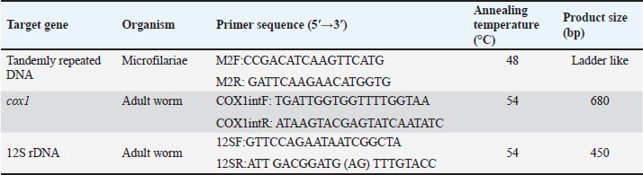 AbstractBackground: The Setaria nematode, classified within the order Spirurida and family Setariidae, has predilection in the peritoneal cavity of its host, with mosquitoes acting as vectors for transmitting microfilariae to cattle, its primary host. Aim: This study investigates the morphology and molecular characteristics of Setaria digitata in Aceh cattle and evaluates the effectiveness of three staining solutions lactophenol, glycerol, and lugol 2% for visualizing adult worms. Methods: A total of 124 blood serum and adult worm samples were collected from Aceh cattle at slaughterhouses in Banda Aceh and Bireuen. Microfilariae detection was conducted using the Knott test, while worm morphology was assessed via polymerase chain reaction amplification of the 12S rDNA and cox1 genes. Results: Each staining solution enhanced worm morphology visualization with varying benefits. The Lugol 2% solution offered a complete view of morphology but lacked detail for internal structures. Lactophenol improved the visibility of both morphology and internal organs, though sample integrity declined quickly. Glycerol displayed both the morphology and internal structures with clarity, making it the most effective option overall. Molecular amplification results showed a 450 bp band for the 12S rDNA gene and a 680 bp band for the cox1 gene in S. digitata. Conclusion: Glycerol proved superior for maintaining morphology and visualizing the internal structures of S. digitata. Molecular profiling using the 12S rDNA and cox1 genes effectively confirmed the identity of S. digitata, underscoring the value of these genetic markers for species identification. Keywords: Morfology, Molecular, Setaria, Aceh cow, Staining solutions. IntroductionAceh cow is one of the most bred livestock types chosen by farmers in Aceh, Indonesia. This cow has diverse body shapes, physical attributes, genetic composition, and good adaptive ability in environments with limitations. Thus, they need to be protected, preserved, and have their advantages improved (Mukhtar et al., 2015). Aceh cow has been designated as a cow breed from Indonesia based on the decree of the Ministry of Agriculture of the Republic of Indonesia number 2907/Kpts/OT.140/6/2011 (Makmur et al., 2020). Aceh cow has also been assigned Indonesia National Standard (Standar Nasional Indonesia–SNI) by National Standard Agency number 7651.3:2013 as a meat-producing and working breed (Ikhsanuddin et al., 2018). Aceh cow is a cross of Bos indicus and Bos sondaicus, which have smaller statures compared to other cows. The males commonly have hump and horns. The male and female Aceh cow coat colors that have been assigned in the SNI are brick red and light brown (Mukhtar et al., 2015). Aceh cow is also one of the ruminant livestock with high economic value among the farmers (Mukhtar et al., 2015). Thus, understanding the rearing condition of Aceh cows and the presence of serious health problems such as worm infestation is crucial. Parasitic disease is a factor that may lower livestock productivity. The presence of worms in livestock is often dismissed by farmers despite having a large influence on livestock health and productivity (Purwaningsih et al., 2018). Filaria nematodes are parasites in the tissue and tissue chamber of all vertebrates. Among these filaria nematodes, Setaria sp. worm is a parasite residing in the cow peritoneal cavity where it lives, grows, and sexually reproduces. The male Setaria sp. worm has a small and thin body while the female worm has a longer and thicker body than the male. Setaria sp. worm is a type of worm that commonly causes health problems in cows (Senanayake et al., 2020) Setaria sp. worm has a round long form shaped like a soft thread which can be seen with the naked eye when the cow’s abdomen is opened (Madani et al., 2021). Setaria sp. worm looks like a milky white thin thread, getting thinner by its posterior with an average length of 62.8 ± 9.89 mm (ranging between 40 and 80 mm), when found in adult form and does not cause some kind of pathogenicity to the cow (Dehkordi et al., 2014). The cow is a natural host of Setaria sp. worm. This parasite generally does not cause disease in its natural host. Infective larvae (L3) transmission via mosquitoes as vectors into aberrant hosts such as goats, sheep, or horses and causes serious neuropathological disorders and is often fatal (Senanayake et al., 2020). Mosquitoes are infected by microfilaria upon consuming microfilaria containing blood from a host. These microfilariae grow into infective larvae at the mosquito’s chest muscle within 2 to 3 weeks. Infected mosquitoes transmit these infective larvae to another vulnerable host during their blood feeding (Rafee and Amarpal, 2016). Worm identification was carried out by microscopic observation of the parasite and one of the methods is by observing the worm’s morphology. Worms found in cows usually still cannot be identified macroscopically with the naked eye, so the staining solution should be used to identify the worm with clarity and easier identification. This research used several staining solutions, lugol 2%, lactophenol, and glycerol. According to Hastuti and Haryatmi (2021), these solutions can produce a clear background and clear worm morphology which make the worms transparent. Other than identification with different staining solutions, molecular character analysis is also required to ensure that the species found matches the desired target, which in this case was Setaria digitata worm. Therefore, The objective of this research is to conduct morphological and molecular characterization of S. digitata worms in Aceh cows and to determine a good staining solution for identifying S. digitata worms from cows slaughtered in Banda Aceh and Bireuen slaughterhouse. Materials and MethodsThe blood and worm sample collection was obtained through direct methods from slaughtered cows and extracted innards. Setaria sp. worms located in the per