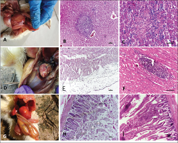 Fig. 2. Gross and Histopathological changes in chicks affected with Salmonellosis. A: Bronze discoloration of liver. B: Diffuse coagulative necrosis of hepatocytes and focal area of heterophil infiltration. (H.E) C: Focal necrosis of hepatocytes along with heterophil infiltration (H.E) D: Broiler chick affected with salmonella revealing elevated greyish nodules on heart E: Section of heart revealing thickened pericardium along with infiltration by heterophils. (H.E) F: Focal infiltration of myocardium by degenerated heterophils. (H.E.) G: Broiler chick affected with salmonella revealing swollen and foam filled caeca. H: Section of intestine from salmonella affected chick revealing degeneration and desquamation of lining epithelium. (H.E) I: Fusion of villi and infiltration in lamina propria. (H.E).