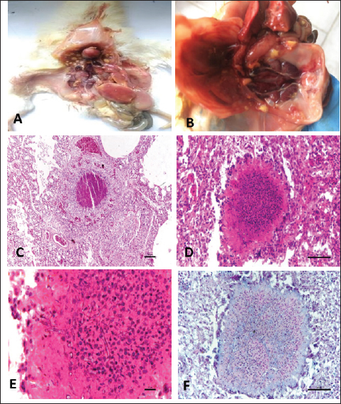 Fig. 3. Gross and Histopathological changes in chicks affected with Aspergillosis. A: Chick affected with aspergillosis revealing white caseous nodules scattered throughout lungs. B: Chick affected with aspergillosis revealing white caseous nodules scattered on abdominal serosa C: Focal granuloma development in the parabronchi. Also note the heterophil infiltration around the necrotic area. (H.E) D: Section of lung from aspergillosis affected chick revealing focal granuloma consisting of central necrotic area mixed with heterophils and surrounded by giant cells. Also note the fungal hyphae in the central necrotic area. (H.E) E: Central necrotic area revealing presence of degenerated heterophils and fungal hyphae more clearly. (H.E) F: Revealing presence of fungal hyphae in the central necrotic area. (PAS). Aspergillosis: Lung and the air sacs were seen mostly affected by the fungus with small white caseous nodules observed scattered throughout the air sacs and lungs (Fig. 3A, B). Histopathologically, focal granulomatous reaction was frequently observed in the lungs. The granulomas were characterized by a central necrotic area with infiltration of heterophils, macrophages, epithelioid cells, and giant cell formation. (Fig. 3C, D, E, and F). Gout: Gout resulted in severe gross lesions in the kidneys marked by paleness of both the kidneys and the appearance of ureters filled with urates (Fig. 4A). Heart was the second most affected organ affected with urate deposition mainly on the pericardium giving a plaster-like appearance (Fig. 4B). Microscopic lesions in kidneys were characterized by focal to diffuse cystic dilation of renal tubule, intertubular hemorrhages, distortion of tubular parenchyma with desquamation of tubular epithelium (Fig. 4C), tubular degeneration, deposits of urates in the tubular parenchyma in the form of pink amorphous radiating material surrounded by a narrow zone of inflammatory cells and occasional infiltration of heterophils and mononuclear cells. (Fig. 4D). The urate deposits gave a positive reaction with De-Galantha stain and appeared as black needle-shaped crystals (Fig. 4E). Lesions in the heart were mainly restricted to pericardium consisting of variable degrees of congestion, hemorrhages, oedema, and thick masses of urate deposition as homogeneous pinkish amorphous material (Fig. 4F). Lesions in the liver were characterized by focal to diffuse areas of coagulative necrosis and urate crystal deposition in hepatic parenchyma.