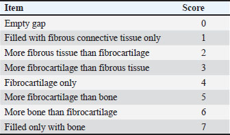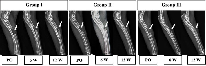 Ethical approvalThe experimental protocol was approved by the Zagazig University Committee of Animal Welfare and Research Ethics. ResultsRadiographic findingsThe mediolateral radiograph was obtained immediately following the surgical procedure. The radiographs in group I were radiolucent, while those in group II were marginally radiopaque. Group III radiographs serve as illustrations of radiopaque density (Fig. 2). Following 6 weeks post-implantation, the radiographs of the segmental bone defect in group I showed a lack of bone union and considerably reduced radiopacity when compared to the neighboring healthy bone, indicating that bone regeneration is limited. Compared to group I, groups II and III showed a significant reduction in the extent of defects due to enhanced bone regeneration but without identifying the bone union (Fig. 2). Table 3. Histological examination Emery’s scoring system.