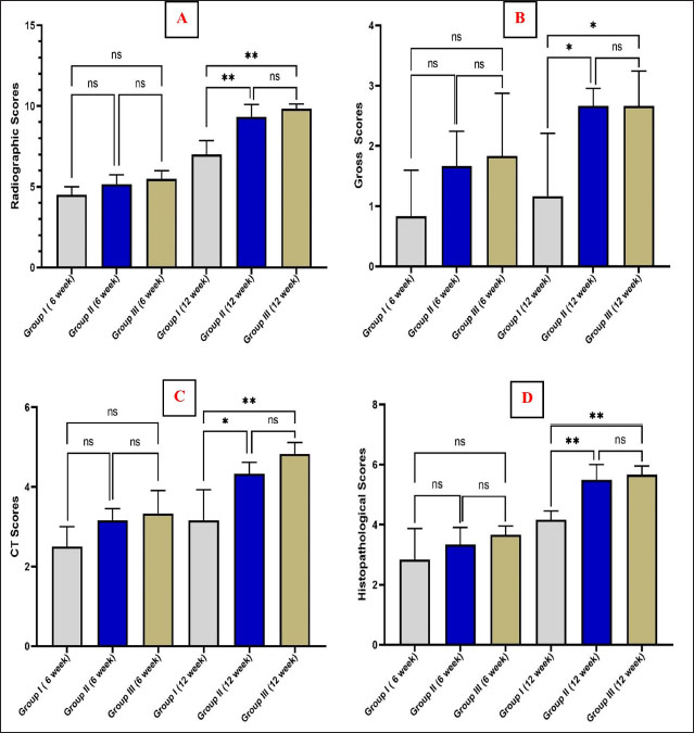 Fig. 3. Graphs quantitatively represent (A) Lane–Sandhu Radiographic Scoring System, (B) gross examination scoring system, (C) CT using Cheung’s scoring method, and (D) histological examinations using Emery’s scoring system. The “ns” denoted the absence of a statistically significant difference. The asterisk (*) indicated that there was a statistically significant difference with a p-value of less than 0.05, while (**) indicated that there was a highly statistically significant difference with a p-value of less than 0.01.