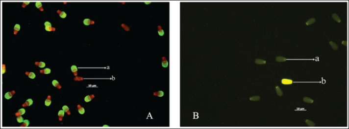Fig. 2. The sperm evaluation used fluorescence microscopy: (A) Acrosome integrity FITC-PNA with PI staining of the Pasundan bulls sperm show acrosome-intact bright green (a) over the acrosomal cup, and acrosome-loss sperm (b) show no FITC-PNA staining; (B) Sperm deficiency protamine using chromomycin A3 (CMA3) staining. Yellowish green (a) round-headed sperm cells show protamine deficiency, and bright yellow (b) round-headed sperm cells show average protamine content.