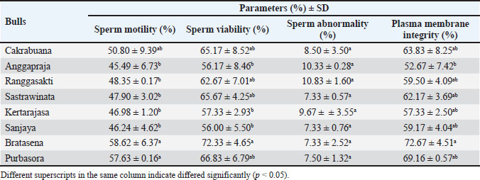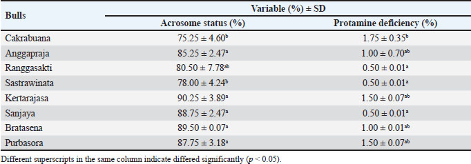 Methods: Frozen semen from eight Pasundan bulls was obtained from the West Java Regional Artificial Insemination Center. Sperm motility was assessed using computer-assisted sperm analysis (CASA; SpermVision®, Germany). Sperm viability and abnormalities were determined by eosin-nigrosine staining. Plasma membrane integrity was evaluated using the hypoosmotic swelling test, acrosome integrity was assessed using fluorescein isothiocyanate–propidium iodide, and protamine deficiency was measured using chromomycin A3 fluorescence staining.