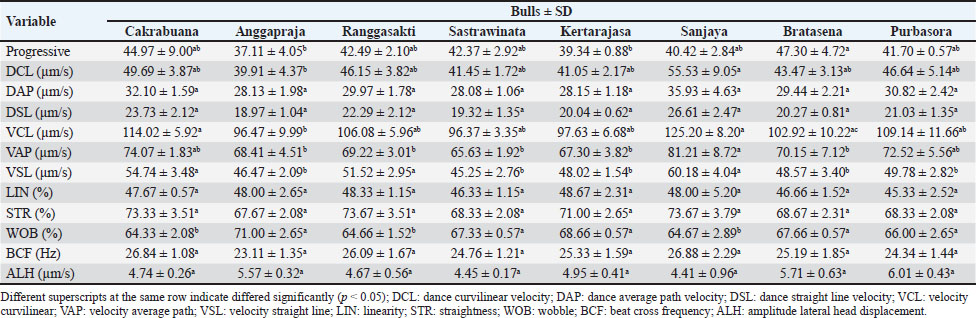 The ability of sperm to reach the fertilization site is critically influenced by their motility patterns. In the present study, the DCL exhibited the highest value in Sanjaya and the lowest in Anggapraja (Table 2).
