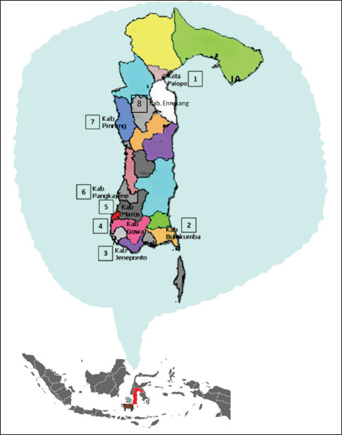 Samples were collected from eight districts in South Sulawesi Province, Indonesia, throughout 2023. This location was selected because it had the highest cattle population in South Sulawesi. The location of these areas is shown in Figure 1. The average annual temperature is 26°C.
