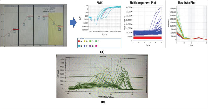 Fig. 3. (a) Real-time RT-PCR amplification by serotype-specific primers and probes 3D gene (b) Melting curve analysis optimization reaction.
