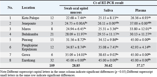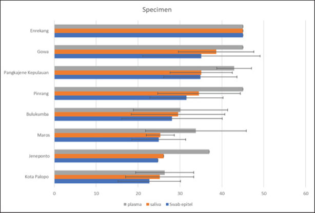 Our results showed that the mean Ct value of samples from 8 districts in South Sulawesi Province were 28.90; 30.62; and 37.17 of FMD PCR positive for the oral mucosal epithelial swabs, saliva, and blood plasma specimens, respectively. Almost similar and sensitive results observed compared to positive controls from the Farma Veterinary Center used (ct=29.10) were oral mucosal epithelial swabs. These results indicate that the sensitivity value of oral mucosal epithelial swab specimens is the same as positive controls, even more sensitive, and also compared to saliva or blood plasma specimens. The ANOVA analysis showed significance (p > 0.05) between specimens (Table 1; Fig. 4).