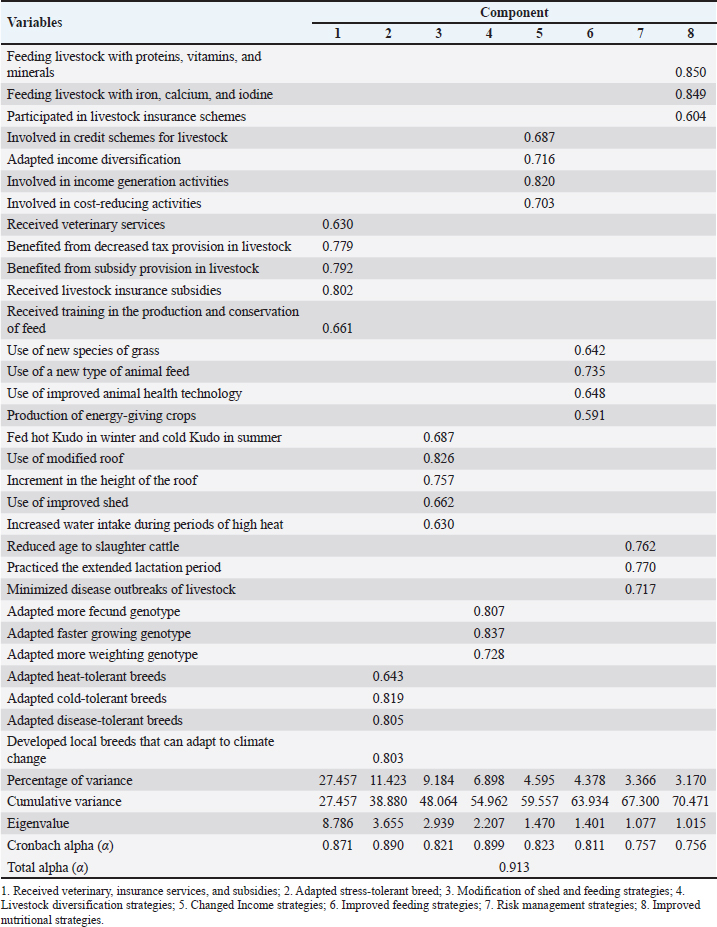 Exploratory factor analysisExploratory factor analysis was used to reduce the large set of variables into manageable factors. At the initial stage, a Kaiser–Meyer–Olkin measure of sampling adequacy was conducted, and the result was found significant (p < 0.001), indicating that the sample for the factor analysis was adequate. Bartlett’s test of sphericity was also significant (p < 0.001), which permitted running the factor analysis. Only factors with total initial eigenvalues greater than one were considered for further analysis. Out of 56 responses, only 31 were retained during factor analysis. These thirty-one responses were divided into eight components having total initial Eigenvalues greater than 1, explaining 70.41% of the total variance. Principal component analysis was used to extract the factors. Out of the total components extracted by factor analysis, the first component received veterinary, insurance service, and subsidies, which showed about a 27.0% variation. The second component adapted heat-tolerant breeds and explained 11.42% variation, followed by 9.18% by the modified shed and changed feeding strategies by the third component. The fourth component is livestock diversification strategies, with 6.89%. Similarly, the fifth component is changed income strategies, with a 4.59% variation followed by 4.38% for improved feeding strategies. Furthermore, the seventh component, “risk management strategies,” covers 3.37%, and the eighth component is about improved nutritional strategies. Table 2 shows the eigenvalues and percent of the variation explained by the components of factor analysis. Finally, these components were added to get the total adaptation index. This variable has been treated as a dependent variable to run the multiple linear regression. Multiple linear regressionMultiple linear regression examined the determinants associated with adaptation practices among males and females. The mathematical form of the multiple linear regression model is as follows: Table 2. Rotated component matrix showing percent of variation, eigenvalues, and Cronbach Alpha.