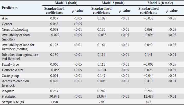 Furthermore, model 3 (Table 5) presents the determinants of adaptation strategies to climate change impact on livestock by females. Among the predictors included in the model, only availability of food, jobs other than agriculture and livestock, and access to credit on livestock are the significant predictors. DiscussionLivestock is one of the major sources of livelihood for smallholder farmers in developing countries such as Nepal. Although females have a significant contribution in the livestock sector, they are less acknowledged in Nepal (Upadhyay, 2003). The impact of climate change is a serious threat to livestock production and productivity. Males and females face the impact of climate change differently (Singh et al. 2010). The role of gender in adaptation has also been changing in the context of climate change (Jianjun et al., 2015). This study shows significant differences in selected background characteristics by gender. These findings are also consistent with the results of the studies by Akter et al. (2016) and Jianjun et al. (2015). Factor analysis identified eight significant strategies adapted by the farmers and it was noted that gender did not show any significant differences in adaptation strategies. A Nigerian study by Olutegbe (2019) also claims that gender does not matter in the adaptation strategies of agriculture farmers. However, other studies reveal that gender is a significant factor in adaptation strategies (Deressa, 2009). Table 5. Determinants of adaptation to climate change on livestock among male, female, and both.