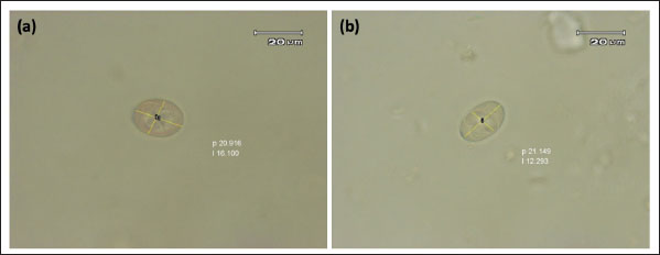 Fig. 2. Sporulated E. christenseni (a) and E. arloingi (b). According to the results of a comparative study of the sequences, 99.4% to 100% of the Eimeria spp. from goat samples were identified and were similar to E. christenseni and E. arloingi. Additionally, the sequence similarities between Eimeria spp. from goats and Eimeria ahsata from sheep ranged from 99.0% to 99.6% (Table 4). A maximum likelihood phylogenetic tree was constructed using the 18S rRNA gene, incorporating Eimeria isolates and reference Eimeria spp. from GenBank. BLAST analysis was performed to match the reference sequences from GenBank with those of the Eimeria isolates. Our findings revealed a strong correlation between Eimeria isolates and Eimeria spp. from Myanmar, China, Iran, and Australia (Fig. 3). Table 4. Pairwise identities (%) among the 18S rRNA sequences of Eimeria samples with E. christenseni, E. arloingi, and E. ahsata.