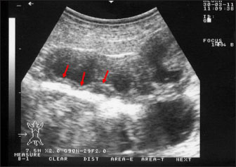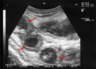 Fig. 3. Ultrasonography of the corrugated intestinal mucosa in a goat with paratuberculosis. The lesion (red arrows) was best imaged longitudinally