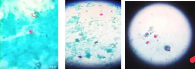Fig. 1. Cryptosporidium oocyst by microscopical examination × 100 (oil immersion lens) in fecal samples.
