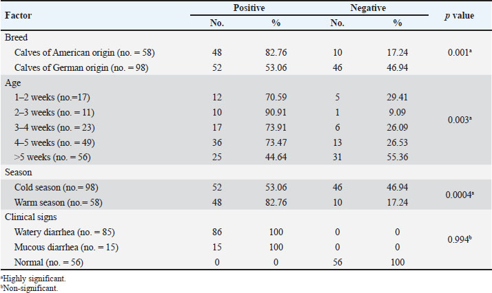 Regarding demographic data and clinical signs in the examined calves, the prevalence of cryptosporidiosis was shown to be increased among American breeds (82.76%, 48/58) (p=0.001), among calves of age group (>2–3 weeks) (90.91%, 10/11) (p=0.003), prevailing of warm climate (82.76%, 48/58) ( p=0.0004), and among calves suffered from watery and mucous diarrhea (100% each) than those showed normal diarrhea (0%) ( p=0.994).