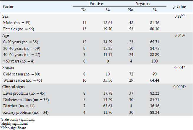 The chi-square test was used to compare the proportions of seropositive results between groups according to Zaghawa et al. (2016) where IBM SPSS Statistics 22.0 (IBM Corporation, Armonk, NY) was used for data analysis. A significance level of p < 0.05 was used.‎