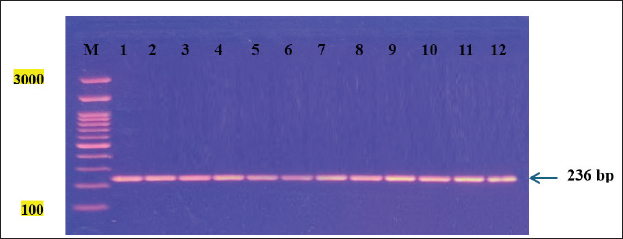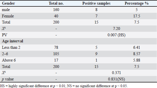The results were also evaluated as follows: S/P ≥ 50% and S/P ≤ 40 are considered as positive and negative, respectively. Molecular investigation of N. caninumGenomic DNA isolation Genomic DNA from the tissue samples: the brain and muscles were isolated using a DNA isolation Kit (Geneaid/ New Taipei City, Taiwan) according to the manufacturer’s instructions. The DNA obtained from the extraction process was evaluated for quality and quantity using a NanoDrop. The target DNA was positioned in a 1.5 ml Eppendorf tube and kept in –20°C storage. 5.8S rRNA primer setThe polymerase chain reaction (PCR) primer pair utilized for the identification of N. caninum were designed Primer3 and the NCBI websites. The primer sequences were NS-F-5ˊATTTATTCCTATATTA-3ˊ and NS-R-5ˊGGGCTTTACATACTACTACG-3ˊ.. PCRThe PCR had been performed in a total volume of 50 μl. The reaction mixture consisted of 6 μl DNA template (100 ng), 25 μl 2 × EasyTaq® PCR Super Mix, 3 μl forward primer, 3 μl reverse primer, and 15 μl nuclease-free water. The PCR conditions in the PCR thermocycler (Techne, Ramsey, MN) were set as follows: Initial denaturation: 95°C, 5 minutes, 30 cycles: Each cycle: Denaturation: 94°C, 30 seconds, Annealing: 50°C, 30 seconds, Extension: 72°C, 30 seconds, and a final extension of one cycle at 72°C for 10 minuted. After the termination of PCR, the PCR product was evaluated by 1% agarose gel electrophoresis. The expected PCR product of 236 bp was visualized using a UV-transilluminator. Statistical analysisThe obtained datum was exposed to a chi-square test to assess the various parameter values impacting the infection rate, with statistical significance specified at (p≤0.05) and (p≤0.01) levels (SAS, 2012). Ethical approvalIn this study, no live animals were harmed, as all samples were collected from animals that had already been slaughtered for commercial purposes. The handling of these samples strictly followed relevant national or institutional guidelines for biosafety and ethics. To protect privacy, all samples were anonymized to ensure that the identity of both the source locations and the animals was protected. Confidentiality was maintained throughout the process, and results were reported in a way that guaranteed anonymity for the businesses and animals involved. Participation in the study was voluntary, and shop or slaughterhouse owners/managers could refuse permission for sample collection without any consequences. Additionally, stringent biosafety protocols were followed to ensure the safety of all personnel and prevent contamination during sample collection. Table 1. Infectivity percent of N. caninum in cattle according to sex and age by ELISA.
