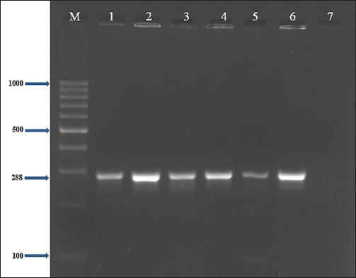 Fig. 3. Two percent agarose gel electrophoresis displaying the amplification of the clfA gene with molecular weight (288 bp) in S. aureus isolates.