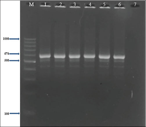Fig. 5. Two percent agarose gel electrophoresis displaying the amplification of the coa gene with molecular weight (674 bp) in S. aureus isolates. Table 4. Types of the gene profiles of the S. aureus isolates (n=14) from sheep milk.