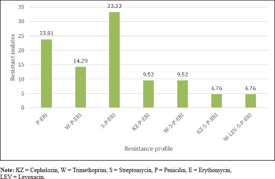 Fig. 4. Diagram of K. pneumoniae resistance profile. ConclusionKlebsiella pneumoniae was found in duck cloacal swabs taken from duck farms in three different sub-districts, namely Paras sub-district, Karang Turi sub-district, and Tembelang sub-district, Jombang district, as many as 100% (21/21) samples (100%) isolates were resistant to antibiotics and 76.19% (16/21) isolates were multidrug resistant. This study showed that 76.2% (16/21) samples were MDR to chepalozin, trimethoprim, levoxacin, streptomycin, penicillin, and erythomycin. The presence of bacteria that are resistant to many types of antibiotics is a threat to public and animal health. Veterinary policies and supervision are important to implement in the treatment of diseases and livestock in Indonesia. AcknowledgmentsThis study was done to fulfill the requirements for Degree in Master of Science in Veterinary Disease and Veterinary Public Health, Faculty of Veterinary Medicine, Universitas Airlangga. Conflict of interestThe authors declare that there is no conflict of interest. FundingThis study was partly supported by The International Research Consortium, Lembaga Penelitian dan Pengabdian Masyarakat, Universitas Airlangga, Surabaya, Indonesia in the year 2024 with grant number: 171/UN3.LPPM/PT.01.03/2024. Author’s contributionsNLNT and WT: Conceptualization and design. WW, SNA, and ZAB: Acquisition of data. MHE and IBM: Formal analysis and interpretation of data. ARK and YP: Writing-original draft preparation. SMY, RZA, and KHPR: Writing-review and editing. All authors have read and agreed to the published version of the manuscript. Data availabilityAll data are available in the manuscript. ReferencesAkpaka, P.E., Vaillant, A., Wilson, C. and Jayaratne, P. 2021. Extended spectrum beta-lactamase (ESBL) produced by gram-negative bacteria in Trinidad and Tobago. Int. J. Microbiol. 2021(1), 5582755. Alders, R.G., Dumas, S.E., Rukambile, E., Magoke, G., Maulaga, W., Jong, J. and Costa, R. 2018. Family poultry: multiple roles, systems, challenges, and options for sustainable contributions to household nutrition security through a planetary health lens. Matern. Child Nutr. 14(Suppl 3), e12668. CDC. 2019. Antibiotic resistance threats in the United States. Atlanta, Georgia, United States. Centers for Disease Control and Prevention. Available at: https://www.cdc.gov/drugresistance/pdf/threatsreport/2019-ar-threats-report-508.pdf. Accessed on August 15, 2024. Comerford, K.B., Miller, G.D., Kapsak, W.R. and Brown, K.A. 2021. The complementary roles for plant-source and animal-source foods in sustainable healthy diets. Nutrients 13(10), 3469. Effendi, M.H., Bintari, I.G., Aksoro, E.B. and Hermawan. I.P. 2018. Detection of blaTEM Gene of Klebsiella pneumoniae Isolated from swab of food- producing animals in East Java. Trop. Anim. Sci. J. 41(3), 174–178. Fanissa, F., Effendi, M.H., Tyasningsih, W. and Ugbo, E.N. 2022. Multidrug-resistant Salmonella species from chicken meat sold at Surabaya Traditional Markets, Indonesia. Biodiversitas 23(6), 2823–2829. Franklin-Alming, F.V., Kaspersen, H., Hetland, M.A.K., Bakksjø, R.J., Nesse, L.L., Leangapichart, T., Löhr, I.H., Telke, A.A. and Sunde, M. 2021. Exploring Klebsiella pneumoniae in healthy poultry reveals high genetic diversity, good biofilm-forming abilities and higher prevalence in Turkeys than broilers. Front. Microbiol. 12(1), 725414. Henchion, M., Moloney, A.P., Hyland, J., Zimmermann, J. and McCarthy, S. 2021. Review: trends for meat, milk and egg consumption for the next decades and the role played by livestock systems in the global production of proteins. Animal 15(Suppl 1), 100287. Iramiot, J.S., Kajumbula, H., Bazira, J., Kansiime, C. and Asiimwe, B.B. 2020. Antimicrobial resistance at the human-animal interface in the Pastoralist Communities of Kasese District, South Western Uganda. Sci. Rep. 10(1), 14737. Khairullah, A.R., Rahardjo, D., Rahmahani, J., Tyasningsih, W. and Harijani, N. 2019. Antibiotics resistant at Staphylococcus aureus and Streptococcus sp isolated from bovine mastitis in Karangploso, East Java, Indonesia. Indian J. Forensic Med. Toxicol. 13(4), 439–444. Lee, D., Oh, J.Y., Sum, S. and Park, H.M. 2021. Prevalence and antimicrobial resistance of Klebsiella species isolated from clinically ill companion animals. J. Vet. Sci. 22(2), e17. Li, Y., Kumar, S., Zhang, L., Wu, H. and Wu, H. 2023. Characteristics of antibiotic resistance mechanisms and genes of Klebsiella pneumoniae. Open Med. (Wars). 18(1), 20230707. Patilaya, P., Husori, D.I. and Marhafanny, L. 2019. Susceptibility of Klebsiella Pneumoniae isolated from Pus specimens of post-surgery patients in Medan, Indonesia to selected antibiotics. Open Access Maced. J. Med. Sci. 7(22), 3861–3864. Permatasari, D.A., Witaningrum, A.M., Wibisono, F.J. and Effendi, M.H. 2020. Detection and prevalence of multidrug-resistant Klebsiella pneumoniae strain isolated from poultry farms in Blitar, Indonesia. Biodiversitas 21(10), 4642–4647. Prayudi, S.K.A., Effendi, M.H., Lukiswanto, B.S., Az Zah-Ra, R.L., Benjamin, M.I., Kurniawan, S.C., Khairullah, A.R., Silaen, O.S.M., Lisnanti, E.F., Baihaqi, Z.A., Widodo, A. and Riwu, K.H.P. (2023). Detection of Genes on Escherichia coli producing extended spectrum β-lactamase isolated from the small intestine of ducks in traditional markets Surabaya City, Indonesia. J. Adv. Vet. Res. 13(8), 1600–1608. Rahman, M.T., Sobur, M.A., Islam, M.S., Ievy, S., Hossain, M.J., El Zowalaty, M.E., Rahman, A.T. and Ashour, H.M. 2020. Zoonotic diseases: etiology, impact, and control. Microorganisms 8(9), 1405. Riwu, K.H.P., Effendi, M.H., Rantam, F.A., Khairullah, A.R. and Widodo, A. 2022a. A review: virulence factors of Klebsiella pneumonia as emerging infection on the food chain, Vet. World 15(9), 2172–2179. Riwu, K.H.P., Rantam, F.A., Effendi, M.H., Khairullah, A.R., Widodo, A., Kurniawan, S.C. and Ugbo, E.N. 2022b. Molecular detection of extended spectrum β-lactamase producing K