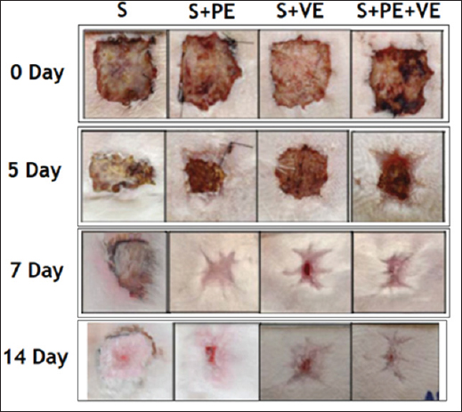 Fig. 6. The figure displays a photographic record of wound healing progression in individual rabbits from each of the four treatment groups—Control, A. Vera, vitamin E, and Combined (A. Vera + vitamin E). The images were captured at four key time points: Day 0 (baseline), Day 4, Day 7, and Day 14, documenting the morphological changes in wound size and appearance over time. Histopathological findings on day 14 further supported the superior wound healing observed in the combined treatment group. This group exhibited nearly complete re-epithelialization, dense granulation tissue formation, and the highest levels of collagen deposition. These findings indicate that combined treatment facilitated advanced wound healing by enhancing both the proliferation and remodeling phases. The process of reepithelialization involves the migration and proliferation of keratinocytes to cover the wound surface, which is essential for restoring skin barrier function. The nearly complete reepithelialization observed in the combined group suggests that wound healing was significantly accelerated compared with the other groups. Aloe vera’s ability to stimulate the migration and proliferation of epithelial cells, combined with vitamin E’s membrane-stabilizing effects, likely contributed to this enhanced result (Zhao et al., 2016). Granulation tissue consists of new capillaries, fibroblasts, and extracellular matrix components like collagen, and its formation is critical for wound repair. The dense granulation tissue observed in the combined group reflects more advanced wound healing, as both A. vera and vitamin E stimulate fibroblast proliferation and collagen synthesis. Aloe vera contains polysaccharides like acemannan, which have been shown to stimulate fibroblast activity and increase granulation tissue formation, while vitamin E aids in protecting these newly formed cells from oxidative stress (Moreira et al., 2024). Collagen is a primary structural component of the extracellular matrix in the skin, and its synthesis is critical for tissue strength and integrity. The higher levels of collagen deposition in the combined group (as indicated by both histopathological analysis and hydroxyproline measurements) suggest that A. Vera and vitamin E work together to enhance the synthesis and organization of collagen fibers, leading to stronger and more resilient healed tissue (Altay et al., 2023). Biochemical analysis was used to further elucidate the mechanisms underlying the improved wound healing in the combined treatment group. The hydroxyproline levels (a marker of collagen content) were significantly higher in the combined group (6.0 mg/g tissue), indicating enhanced collagen synthesis. This supports the hypothesis that the combination of A. Vera and vitamin E acts synergistically to promote collagen production, which is crucial for wound contraction and strength. Antioxidant enzyme activities (SOD and CAT) were also markedly higher in the combined group compared with the other groups. This suggests that the combination of A. Vera and vitamin E provides superior protection against oxidative stress, a key factor that can impair wound healing by causing cellular damage (Liu et al., 2021). SOD and CAT are important enzymes that mitigate oxidative stress by neutralizing reactive oxygen species. Elevated SOD and CAT activities in the combined treatment group indicate a stronger antioxidant defense, allowing for better preservation of cellular function and tissue integrity during the wound healing process. Vitamin E’s role as a lipid- soluble antioxidant is well established, and its ability to protect cell membranes from oxidative damage is likely enhanced by the anti-inflammatory properties of A. Vera, which reduces the oxidative burden in the wound area (Liang et al., 2021). Sofini et al. (2024) reported that nanohydrogels infused with selected plant extracts effectively promote scarless wound healing by enhancing collagen synthesis and reducing inflammation. The combined treatment’s superior performance across all parameters—wound closure rate, histopathological features, and biochemical markers—strongly suggests a synergistic effect between A. Vera and vitamin East Although both agents independently improved wound healing, their combination enhanced healing to a greater extent than either agent alone. Sharon et al. (2024) comprehensively reviewed nanostructure-assisted wound dressing materials, highlighting their superior biocompatibility and effectiveness in accelerating wound healing. This synergy likely arises from A. vera’s role in modulating inflammation and stimulating fibroblast activity, combined with vitamin E’s antioxidant properties and collagen-enhancing effects. Aloe vera’s ability to reduce proinflammatory cytokines (e.g., interleukin-1 and tumor necrosis factor-alpha) and its antimicrobial properties create a favorable environment for healing, while vitamin E prevents oxidative damage and supports cellular repair (Barbosa et al., 2021). Mercy et al. (2024) demonstrated that nanohydrogel formulations combining plant extracts and nanosilver significantly enhance wound healing by reducing oxidative stress and promoting tissue regeneration. Together, these actions create an optimal environment for wound healing, allowing for faster re-epithelialization, enhanced granulation tissue formation, and more efficient collagen synthesis (Jessy et al., 2024). These findings have important clinical implications for wound management. The combination of A. Vera and vitamin E could be used as a topical treatment to enhance wound healing in both human and veterinary medicine. This treatment may be particularly beneficial for patients with chronic wounds or those with impaired healing capacity, such as those with diabetes or compromised immune systems. The natural origin and minimal adverse effects of A. vera and vitamin E make these agents attractive alternatives to synthetic wound-healing agents