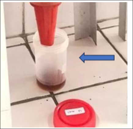 Fig. 2. Urine collected from T9 showed signs of hematuria. Blue arrow=urine in red color. The histopathological picture of the results of observations of renal tubular cell necrosis in each group can be seen in the following Figure 4. Inflammatory cell infiltration of renal tubulesObservation of kidney damage in male mice (Mus musculus) in the form of inflammatory cell infiltration was carried out microscopically using histopathology preparations with a magnification of 400x. Inflammatory cell infiltration can be observed in the interstitium of the renal tubules (Fig. 5). The table above shows that there is a significant difference (p < 0.05) between group C and groups T2, T3, T4, T5, T6, T7, T8, T9, T10, and not significantly different (p > 0.05) with group T1. Group C showed the lowest mean rank value of inflammatory cell infiltration, and group T10 showed the highest mean rank value. There was a significant difference (p < 0.05) between group T1 and groups T3, T4, T5, T6, T7, T8, T9, T10 and not significantly different (p > 0.05) with group T2. The T2 group showed a significant difference (p < 0.05) with T4, T5, T6, T7, T8, T9, T10 and was not significantly different (p > 0.05) with the T3 group. The T3 group showed significant differences (p < 0.05) with T5, T6, T7, T8, T9 and T10 and not significantly different (p > 0.05) with the T4 group. The T4 group was not significantly different (p > 0.05) from T5 and T6 but was significantly different (p < 0.05) from T7, T8, T9, and T10. The T5 group showed a significant difference (p < 0.05) with T8, T9, T10 and not significantly different (p > 0.05) with T6, T7. The T6 group showed a significant difference (p < 0.05) with T9 T10 and not a significant difference (p > 0.05) with T7, T8. The T7 group showed a significant difference (p < 0.05) with T9 T10 and was not significantly different (p > 0.05) with T8. The T8 group showed a significant difference (p < 0.05) with T10. Furthermore, the T9 group was not significantly different (p > 0.05) from T10 (Table 5).
