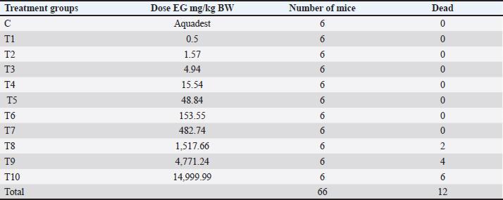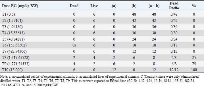 Based on the formula above, the result of the LD50 calculation of EGcol in mice (Mus musculus) is 1.598 mg/kg bb The formula for converting EG doses from mg/kg to ml/head is:
