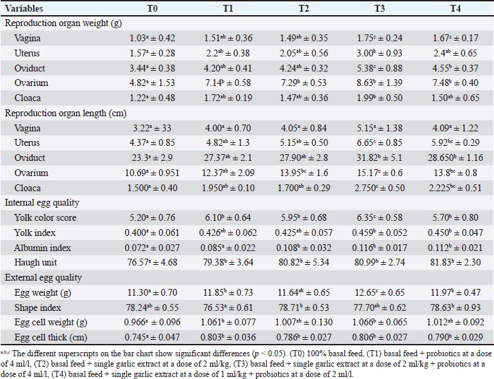 In the same condition on reproduction organ length morphological measurement (Table 3), the treatment group’s combinations of probiotics and single garlic extract on the uterus, oviduct, ovarium, and cloacal organs showed differences with the basal feed group (T0), whereas on vaginal organ length morphological variable was not significantly difference between the other groups. Internal quality eggsIn this research, the effect of treatment supplementation, such as probiotics, single garlic extracts, and combinations of the others, can generally increase the internal egg’s value than a control group. The statistical analysis result showed that the yolk color score, yolk index, albumin index, and Haugh unit for combination probiotic and single garlic extract groups (T3, T4) showed significant differences with other groups (T0, T1, T2). The supplementation probiotic group (T1) and single garlic extract group (T2), on measurement variable of yolk color score and Haugh unit, showed significant differences with a control group (T0). For the yolk index, the probiotic and single garlic extract groups (T1 and T2) did not have significant differences with the control group (T0). External quality eggsVariables measuring the external quality of eggs are egg weight, shape index, egg cell weight, and egg cell thickness. In general, probiotic supplementation, single garlic extract, and other combinations in the treatment group can provide benefits for increasing egg weight, egg cell weight, and egg cell thickness (Table 3). Meanwhile, the measurement of the egg shape index variable showed no significant differences between groups (T0, T1, T2, T3, and T4). DiscussionIn this study, the addition of feed additives with probiotics, single garlic extract, and their combination compared with the control group, which was only given basal feed with no treatment, was able to provide a positive increase in the performance of laying quail. Table 3. Reproduction organ weight, reproduction organ length, internal egg quality, and external egg quality of laying quail.