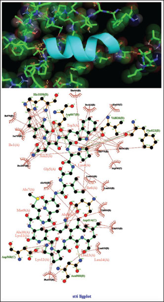 Fig. 2. Surface/glycoprotein of SARS-CoV-2 [PDB ID 7R40] with st2 (PDB ID 7X41) (scorpion toxin) Complex of SARS-CoV-2 surface-glycoprotein–st3 (scorpion toxin 3)The docking analysis of the SARS-CoV-2 surface glycoprotein with st3 (scorpion toxin 3) revealed significant binding affinities with cluster scores of −346.3 kcal/mol for Van der waals and electrostatic forces, −1420.8 kcal/mol for electrostatic favored interactions, −1497 kcal/mol for hydrophobic favored interactions, and −1189.6 kcal/mol for the balanced score. The interaction is stabilized by a hydrogen bond between LYS19 of chain A in st3 and THR21 of chain A in the SARS-CoV-2 surface glycoprotein, with a shortest bond distance of 2.508 Å, as shown in Fig. 3 and detailed in Table 1. Complex of SARS-CoV-2 surface-glycoprotein–st4 (scorpion toxin 4)The docking of the SARS-CoV-2 surface glycoprotein with st4 (scorpion toxin 4) demonstrated significant binding affinities, with cluster scores of −287.8 kcal/mol for Van der waals and electrostatic forces, −1334.8 for electrostatic favored interactions, −1430.7 for hydrophobic favored interactions, and −1259 for the balanced score. The interaction includes non-bonded contacts between ILE205 of chain A in st4 and LEU203 of chain A in the SARS-CoV-2 surface glycoprotein (shortest distance: 3.578 Å), and ILE121 of chain D in st4 and GLY118 of chain D in the SARS-CoV-2 surface glycoprotein (shortest distance: 3.800 Å). Additionally, hydrogen bonding was observed between ARG19 of chain E in st4 and GLN82 of chain E in the SARS-CoV-2 surface glycoprotein, with a shortest distance of 2.717 Å. (Refer to Fig. 4 and Table 1 for details).