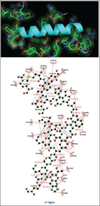 Fig. 7. Surface/glycoprotein of SARS-CoV-2 [PDB ID 7R40] with st7 (PDB ID A9QQ26-F1) (spider toxin). b. Corona spike protein interacted with various non-protein toxins (BIOVIA-Discovery studios visualizer v.21.1.0.20298)SARS-CoV-2 surface-glycoprotein–BL1 (scorpion toxin 9) complexA significant binding affinity of −7.8 kcal/mol was observed during the docking of the SARS-CoV-2 surface glycoprotein against the BL1 (scorpion toxin 9) complex. This ligand interacted with the tyr 102 residue of chain E through H-bonds, and ser 494 of the C-chain acted as an unflavored donor group (Fig. 9; Table 2). SARS-CoV-2 surface-glycoprotein–BL2 (scorpion toxin 10) complexThe docking of the SARS-CoV-2 surface-glycoprotein–BL2 (scorpion toxin 10) complex displayed a significant binding affinity of −5 kcal/mol. This ligand interacted through hydrogen bonds with asn 437, asn 440, leu 441, and asn 439 residues of chain C and pi-sigma bond with trp 104, phe 192 of C-chain and formed Van der waals interaction with asp 442, ser 438, ser 373, arg 509, and asn 434 (Fig. 10; Table 2). SARS-CoV-2 surface-glycoprotein–BL3 (scorpion toxin 11) complexA significant binding affinity of −8.3 kcal/mol was recorded during the docking of the SARS-CoV-2 surface glycoprotein against the BL3 (scorpion toxin 11) complex. This ligand formed Van der waals with gly 103, ile 101, phe 175, gln 173, his 207, and met 177 and interacted through H-bonds with arg 102, asn 121, ser 172, and arg 190 residues of chain B as well as pi-sigma bonds with val 126, val 227, and tyr 170 of the B-chain (Fig. 11; Table 2). SARS-CoV-2 surface-glycoprotein–BL4 (scorpion toxin 12) complexA significant binding affinity of −7.3 kcal/mol was observed during the docking of the SARS-CoV-2 surface-glycoprotein-BL4 (scorpion toxin 12) complex. This ligand made no H-bonds with any of the chains’ residues, but it did form Van der waals interactions with the corona spike protein’s glu 484, tyr 489, tyr 104, phe 490, gln 493, leu 492, ser 494, and tyr 449, as well as a pi-alkali bond with leu 452 od chain C (Fig. 12; Table 2). SARS-CoV-2 surface-glycoprotein–SMP (scorpion toxin 13) complexA significant binding affinity of −6.5 kcal/mol was observed during the docking of the SARS-CoV-2 surface-glycoprotein-SMP (scorpion toxin 13) complex. This ligand formed Van der waals interactions with tyr 104, leu 455, gln 493, asn 53, tyr 505, and ile 402. It also interacted through H-bonds with lys 457, tyr 32, 453, 495, and glu 406 residues of the C chain and a pi-sigma bond with ile 418 of the E chain (Fig. 13; Table 2). MD simulations The MD simulation showed that the ligand (Wasp toxin-Mastoparan)–protein (SARS-CoV-2 spike protein) complex had an RMSD of 0.39–0.54 and a radius of gyration (Rg) of 51.236–51.25. The potential energy and Van der Waals surface area (VSA) were also found to be 0.026-0.34 for the ligand and 0.026-0.34 for the protein. This means that the protein and ligand stayed in a stable bond during the experiment, with only minor changes in their shape. The measure of compactness exhibits almost negligible change, which also solidifies the stability of the complex; and potential energy: 5,280,507–5,280,844 and the VSA: 245,950–246,400 Reflecting the ligand-protein surface, respectively, these values clearly demonstrate the stability of the ligand-protein complex under experimental conditions that mimic the cellular environment (Table 3, Fig. 14).