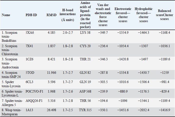 Table 2. Protein–ligand docking results of “PyRx python prescription 0.8” and analyzed through “BIOVIA-Discovery studios visualizer v.21.1.0.20298”: Corona spike protein (PDB ID: 7R40) as target and various toxins as ligand