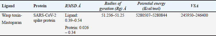 Fig. 14. Represents the RMSD graph of ligand and protein, graph of radius of gyration, potential energy, and Van der waals surface area of complex. ConclusionThe SARS-CoV-2 pandemic threw a challenge for the entire scientific community. The search for treatments for the potentially fatal SARS-CoV-2 infection was started in the year 2019 and is still ongoing, new medications with antiviral properties were searched or developed without a permanent cure. Hence, through the current research, an attempt was made to identify and develop a novel potent antiviral agent derived from natural animal toxins employing promising in silicon approach including virtual screening, molecular docking, and MD simulation. Animal, insect, and plant toxins are potential therapeutic antiviral candidates that could potentially treat SARS-CoV-2 infections with manageable side effects. In this regard, thirteen potential animal toxins from the scorpion, spider, and wasp species were selected and showed a variety of binding interactions with the target protein after molecular docking and the best-interacted toxin was selected for performing MD simulations to understand the stability of the complex formed. Wasp toxin “mastoparan” exhibited favorable interactions with SARS-CoV-2 surface-spike protein with the best affinities scores, hence can be preferred as SARS-CoV-2 surface-spike protein inhibitors. As per the molecular docking results, it binds effectively to one of the chains of the spike protein and impairs its action which could potentially inhibit the viral penetration into the healthy cells. Additionally, MD simulation of the complex formed was also studied employing NAMD/VMD tools to determine the stability and conformational changes if any have taken place post interaction and the complex resulted to be stable under stimulatory conditions resembling cellular environment. Through this in silicon research, it can be explained that the mastoparan with the best scores and other animal toxin with lower scores are to be considered for developing a successful viral entry inhibitor in humans. LimitationsThe study has several limitations that must be acknowledged. A primary limitation is the lack of experimental validation, as the findings are solely based on in silicon methods, including molecular docking and molecular simulation studies. These computational approaches provide valuable insights into binding affinities and interaction stabilities but cannot fully replicate the complexity of biological systems; however, MD simulations were performed under reflecting the cellular standards, and still, it needs to be validated through future studies. Additionally, the focus on structural aspects of wasp toxin and SARS-CoV-2 spike protein interaction does not address the potential immunogenicity of target effects or toxicity in vivo. Another limitation is the limited number of toxins analyzed, which may overlook other promising candidates with similar or superior properties. To address these gaps, future research should prioritize experimental validation through in vitro studies to confirm binding efficacy and inhibitory strength, followed by in vivo studies to assess pharmacological and toxicological efficacies. Alongside, Structural modification can be done to the active molecule to optimize the wasp toxin such as mastoparan for enhanced accuracy and reduced adverse effects could prove expanding the toxin library. Furthermore, employing advanced computational techniques such as quantum mechanics or molecular mechanics simulations may further refine potent candidate selection and provide deeper systematic insights. AcknowledgmentThe authors extend their appreciation to the Deanship of Scientific Research at Jouf University, Saudi Arabia, for funding this work through research grant number (DSR2022-RG-0118). Conflicts of interestThe authors declare no conflict of interest. FundingThis work was funded by the Deanship of Scientific Research at Jouf University under Grant Number (DSR2022-RG-0118) Authors’ contributionsMMA designed the research. MF, MJ, BA, MS, DM, NG, and SA data analysis and writing the manuscript. The manuscript revised by MOG, MF, AA, MS, and MMA. Supervision of the data analysis by MOG. Fund applied by MOG and MF. The final manuscript read, corrected, and approved by all authors. Data availabilityAll data generated or analyzed during this study are included in this article. ReferencesAlhakamy, N.A., Ahmed, O.A.A., Md, S. and Fahmy, U.A. 2021. Mastoparan, a peptide toxin from wasp venom conjugated fluvastatin nanocomplex for suppression of lung cancer cell growth. Polymers 13(23), 4225; doi:0.3390/polym13234225. Alhowaish, T.S., Alhamadh, M.S., Alhabeeb, A.Y., Aldosari, S.F., Masuadi, E. and Alrashid, A. 2022. Outcomes of COVID-19 in inflammatory rheumatic diseases: a retrospective cohort study. Cureus 14(6), e26343; doi:10.7759/cureus.26343. Arzamasov, A.A., Vassilevski, A.A. and Grishin, E.V. 2014. Chlorotoxin and related peptides: Short insect toxins from scorpion venom. Russ. J. Bioorg. Chem. 40, 359–369; doi:10.1134/S1068162014040013. Bansal, P., Kumar, R., Singh, J. and Dhanda, S. 2021. In silico molecular docking of SARS-CoV-2 surface proteins with microbial non-ribosomal peptides: identification of potential drugs. J. Proteins Proteom. 12(3), 177–184; doi:10.1007/s42485-021-00072-z. BIOVIA, D.S. 2020. Discovery studio visualiser v.21.1.0.20298. San Diego, CA: Dassault Systèmes. Chérifi, F. and Laraba-Djebari, F. 2021. Bioactive molecules derived from snake venoms with therapeutic potential for the treatment of thrombo-cardiovascular disorders associated with COVID-19. Protein J. 40(6), 799–841; doi: 10.1007/s10930-021-10019-4. Dallakyan, S. and Olson, A.J. 2015. Small-molecule library screening by docking with PyRx. in Chemical Biology: Methods and Protocols. Eds., Hempel, J.E., Williams, C.H. and Hong, C.C. New York, NY: Springer New York, pp: 243–250. Du, W., Hurdiss, D.L., Drab