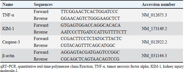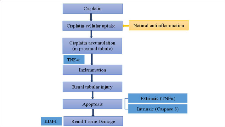 AbstractBackground: Cisplatin (CIS) is a highly effective chemotherapeutic drug. However, it is associated with various side effects, including kidney damage, due to its nephrotoxic properties. Aim: This study aimed to evaluate the renoprotective potential of the combined extract of Curcuma longa and Curcuma zedoaria in reducing nephrotoxicity by examining its effects on tumor necrosis factor-alpha (TNF-α), KIM-1, and caspase-3 levels. Methods: Twenty-five rats were divided into normal control groups (NS), CIS control groups, and three treatment groups that received doses of the combined extract at 100, 200, and 400 mg/kg (CUR100, CUR200, and CUR400), respectively, on day 1–20. All groups, except the NS group (receiving normal saline i.p.), received intraperitoneal CIS (1 mg/kg) on days 7 and 14 of the 20-day extract treatment. Results: Compared with the rats in the CIS group, rats given the combined extract had a considerable gain in body weight and decreased TNF-α, KIM-1, and caspase-3 expression levels. Histopathological examination revealed that the extract group experienced less kidney damage than the CIS group. The combined extract, administered at 200 mg/kg, exerted the most apparent protective effect, decreasing renal TNF-α, KIM-1, and caspase 3. Conclusion: The combined extract of C. longa and C. zedoaria has the potential to be a therapeutic agent for reducing nephrotoxicity by suppressing TNF-α, KIM-1, and caspase-3 levels. Further research is required to determine the potential of this combination therapy in humans. Keywords: Cisplatin, Curcuma longa, Curcuma zedoaria, Inflammation, Nephrotoxicity. IntroductionCurcuma longa, also known as turmeric, is indigenous to India, Indonesia, and South Asia. Numerous conditions involving endocrine, neurological, cardiovascular, digestive, pulmonary, renal, and other systems can be reversed by curcumin (Mantzorou et al., 2018). The Zingiberaceae family member Curcuma zedoaria tends to be referred to as ‟white turmeric” or ‟Zedoary” and contains various plants that are frequently used in traditional treatments (Sharifi-Rad et al., 2017). Curcumin has been isolated from C. longa and C. zedoaria. It also has a broad spectrum of pharmacological activities, including anti-inflammatory, antioxidant, antibacterial, and antineoplastic effects. Considerable scientific interest has been shown in the study of Zhang et al., 2023. Although C. longa and C. zedoaria have anti-inflammatory properties, much more must be learned about their combined actions and underlying molecular pathways to mitigate renal damage caused by cisplatin (CIS). We examined whether these plant anti-inflammatory qualities could lessen the well-known nephrotoxic adverse effects of CIS. The chemotherapy drug CIS (cis-diamminedichloroplatinum II) was administered. Nevertheless, substantial adverse effects, especially nephrotoxicity, accompanying kidney deposits, and CIS biotransformation limit its therapeutic efficacy. Nephrotoxicity is the main adverse effect affecting dosage and is a significant clinical issue, highlighting the significance of studies on the prevention of CIS-induced kidney damage (Volarevic et al., 2019). Apoptosis and inflammation are critical components of the pathophysiology of renal damage caused by CIS. Inflammation is the primary cause of kidney damage caused by CIS. Studies have demonstrated that CIS increases tumor necrosis factor-alpha (TNF-α) levels. Several studies have shown that anti-inflammatory drugs can inhibit CIS-induced inflammation (Ramesh and Brian Reeves, 2002). It has been hypothesized that DNA damage, decreased protein synthesis, and mitochondrial damage leading to apoptosis are the main causes of the adverse effects of CIS. Apoptosis, the primary cause of inflammation, has been linked to several kidney diseases caused by nephrotoxic medications (Santos et al., 2007). Current strategies for mitigating CIS-induced nephrotoxicity are frequently inadequate because of their limited effectiveness, unfavorable side effects, and inability to specifically target the pathways causing kidney damage. Thus, the development of innovative treatment approaches is urgently required. Numerous studies have examined the effects of these difficulties on CIS-induced nephrotoxicity. This study aimed to evaluate the renoprotective potential of the combined extract of C. longa and C. zedoaria in reducing nephrotoxicity by examining its effects on TNF-α, KIM-1, and caspase-3 levels. Materials and MethodsPlant material and extract preparationWe obtained and confirmed taxonomically authenticated rhizomes of C. longa and C. zedoaria (document number 306/IT3. L. P13/TA.00.03/M/B/2023, No. 305/IT3. L. P13/TA.00.03/M/B/2023) from the Tropical Biopharmaca Research Center of IPB University, Bogor, West Java, Indonesia. The extraction process for Simplicia used the maceration method with pharmaceutical-grade 96% ethanol for three consecutive periods of 24 hours each. A 1:10 sample-to-solvent ratio was established (Kemenkes, 2017), and extracts from C. longa and C. zedoaria were combined in equal amounts to create a 1:1 blend. CIS injection preparationCIS was purchased from PT. Dankos Farma, Indonesia. Each vial containing 50 mg/50 ml of water is included in each vial. The amount of CIS administered was determined based on the animal’s body weight (BW). CIS (1 mg/kg) was added without dilution. Animal and experimental designThe rats were procured from the PT. Biofarma, Indonesia. The rats were housed in an animal care facility with a 12-hour day-and-night cycle before the investigation, standard feed, unlimited access to water, temperature (20°C–25°C), and humidity levels (40%–70%) for 1 week to allow them to become acclimated to their environment. Twenty-five male Wistar albino rats were aged 12 weeks (weight range: 175–200 g). Five random groups (n=5 each) of rats were established: normal control (NS), CIS control, extract100 + CIS (CUR100), 