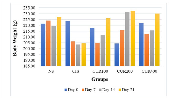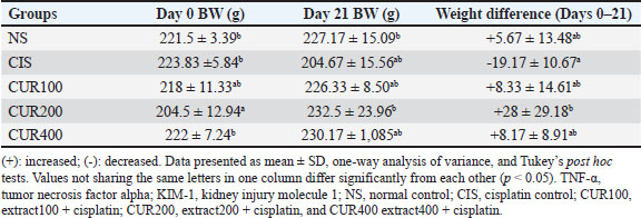 Fig. 2. The effects of the combined extract of C. longa and C. zedoaria on BW were assessed weekly from day 0 to 21 of the trial. TNF-α, tumor necrosis factor alpha; KIM-1, kidney injury molecule 1; NS, normal control; CIS, cisplatin control; CUR100, extract100 + cisplatin; CUR200, extract200 + cisplatin, and CUR400 extract400 + cisplatin. Table 2. Effect of combined extract of C. longa and C. zedoaria administration on the CIS–induced rats’ BW in a treatment group.