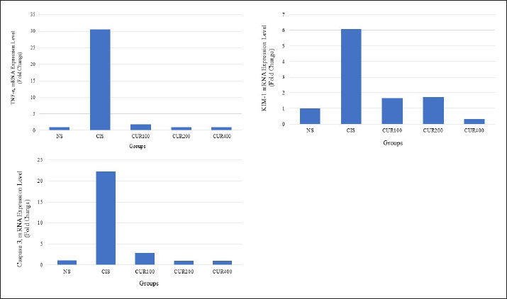 Fig. 3. The combined extracts of C. longa and zedoaria affect the relative kidney weight. Significant differences are indicated by bars with different superscript characters (p < 0.05). TNF-α, tumor necrosis factor alpha; KIM-1, kidney injury molecule 1; NS, normal control; CIS, cisplatin control; CUR100, extract100 + cisplatin; CUR200, extract200 + cisplatin, and CUR400 extract400 + cisplatin. qRT–PCR resultsTo evaluate and compare the results, qRT–PCR was performed by measuring changes in the gene expression cycle thresholds of TNF-α, KIM-1, and caspase 3. The results showed that the CIS group exhibited an increased mRNA expression of these markers compared with the NS group. However, as shown in Fig. 5A–C, the groups treated with the combined extract of C. longa and C. zedoaria showed significantly reduced expression levels, with the most pronounced decreases observed in the CUR200 and CUR400 groups. DiscussionThis study investigated the potential protective effects of combined C. longa and C. zedoaria extracts on rat kidneys against CIS-induced damage. This investigation focused on examining TNF-α, KIM-1, and caspase 3 markers to assess the efficacy of this herbal combination in mitigating the adverse renal effects of CIS. A pathophysiological diagram illustrates the primary molecular mechanisms involved in CIS-induced kidney damage (Fig. 1). The combined extract was administered in multiple doses for 20 days in a row, with the first dose of CIS administered on the seventh day and subsequent intraperitoneal injection of CIS (1 mg/kg) administered 1 week later.