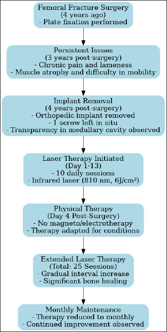AbstractBackground: Chronic pain and delayed bone healing are significant challenges in veterinary rehabilitation following orthopedic surgeries in cats. These issues necessitate advanced modalities for effective management. Laser therapy (LT), also known as photobiomodulation, has shown promise in promoting tissue repair and alleviating pain but remains underused in feline cases. This case report aims to evaluate the efficacy of LT in managing chronic pain and enhancing bone healing in a cat following femoral surgery complicated by orthopedic implant failure. Case Description: A 7-year-old cat presented with persistent lameness and discomfort 3 years post-femoral fracture surgery. Despite initial surgical stabilization, chronic pain and restricted mobility persisted, leading to implant removal. After surgery, the cat underwent 25 sessions of LT using an 810-nm infrared semiconductor laser at a dosage of 6 J. Treatment sessions were conducted over 2 months, beginning 4 days post-surgery. Clinical and radiographic evaluations were performed to assess therapeutic outcomes. The cat demonstrated marked improvement in weight-bearing and mobility, with reduced signs of pain. Radiographic imaging revealed significant bone remodeling and consolidation. The owner reported enhanced activity levels and overall quality of life for the cat. These findings suggest that LT effectively facilitated bone healing and chronic pain relief in this case. Conclusion: LT proved to be a valuable component of multimodal rehabilitation in this feline patient, addressing both chronic pain and delayed bone healing. This case underscores the importance of integrating advanced therapeutic modalities into veterinary practice, particularly for complex orthopedic cases. Further research is recommended to validate these findings in larger, controlled studies. Keywords: Laser therapy, Femoral fracture, Chronic pain. IntroductionThe rise in cat ownership globally has led to a greater need for veterinary care for cats. Conditions such as illness, injury, and surgery can cause acute or chronic pain, necessitating effective pain management to ensure optimal feline welfare, including physical health and emotional well-being. Femoral fractures are frequently seen in cats, representing 20%–26% of all fractures (Rubinos and Meeson, 2022). Surgical repair of diaphyseal femoral fractures should not be delayed, as this can lead to quadriceps contracture due to muscle contusion or laceration (Scott et al., 2022). These fractures require surgical stabilization, typically achieved through methods, such as open reduction and internal fixation or external skeletal fixation (Malik-Tabassum et al., 2020). Orthopedic implant failure is characterized by either the failure of the bone–implant interface, leading to loosening and instability, or mechanical failures such as bending or breakage of the implant (Johnson, 2016). This failure can result from mechanical factors related to load on the construct, biological factors associated with bone healing, or a combination of both (Menghini et al., 2023). Plastic deformation or breakage of implants occurs due to cyclical loading that induces implant fatigue or, less commonly, from an acute high-load event. Larger cyclic-bending loads reduce the fatigue life of the implant (Aikawa et al., 2018). The incidence of implant failure ranges from approximately 5%–19%, depending on the affected bone, fracture configuration, and fixation method (Menghini et al., 2023). Given these challenges, this case underscores the importance of alternative modalities, such as laser therapy (LT), in addressing persistent postoperative complications in feline orthopedic cases. Physical therapy and rehabilitation are an expanding area within veterinary medicine. Unlike dogs, feline patients are less commonly represented in veterinary physical therapy and rehabilitation (Drum et al., 2015). A primary objective of rehabilitation is to achieve a return to normal or near-normal functioning (Brunke, 2017). Light therapy, also known as photobiomodulation, refers to various methods that involve irradiating tissue with different types of light to promote healing. This category includes techniques, such as laser treatment, light-emitting diode therapy, and ultraviolet and infrared light. The exact mechanism of light therapy remains unclear. Light particles, known as photons, are directed into tissues. One theory suggests that photons are absorbed by mitochondrial chromophores in cells, resulting in the photodissociation of inhibitory nitric oxide from cytochrome C oxidase (Millis and Bergh, 2023). This process enhances electron transport, enzyme activity, and Adenosine triphosphate (ATP) production, all of which are crucial for cell proliferation and tissue repair. LT may also aid in muscle recovery (Brunke, 2017). Case DetailsA 7-year-old cat presented at the veterinary surgery clinic, due to persistent lameness and pain on palpation of the left hind limb, which had persisted for over 3 years. The owner noted that the cat had severe difficulty getting onto the kitchen counter while simultaneously showing no issues with appropriately using the litter box. The cat exhibited decreased activity levels, spending more time resting and experiencing difficulty jumping up or down. The cat had undergone orthopedic surgery 4 years ago, during which a plate was placed due to a femoral fracture (Fig. 2). Despite the surgery, the patient continued to show signs of discomfort, necessitating further diagnostics and therapy. During the examination at the radiology clinic, the cat showed signs of lameness and pain. The clinical examination revealed muscle atrophy of the left leg and pain on extension and flexion. Radiographic imaging of the pelvis and left femur revealed changes associated with the implant. Removal of the implant was recommended and subsequently performed. Figure 3 shows the radiographs of the cat’s left femur post-plate remov