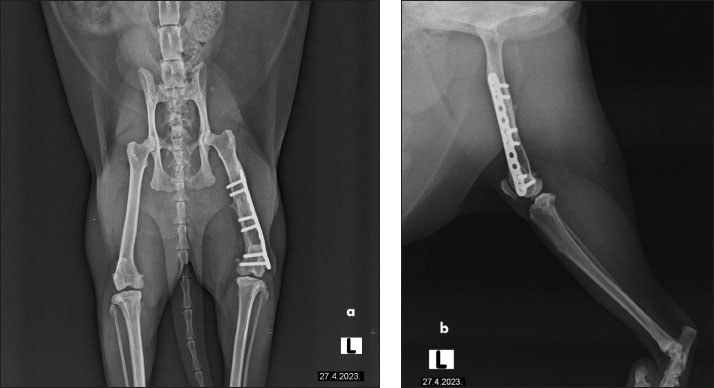Fig. 2. The radiographs of a cat’s left femur show (a) a ventrodorsal and (b) a mediolateral view following fracture repair using a 6-hole plate. The fracture is not visible, indicating satisfactory healing. Bone transparency is observed in the medullary cavity of the femur, further enhancing visualization of the internal bone structure. The plate is properly aligned, with no signs of complications.