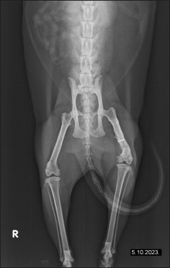 Fig. 5. Radiographic evidence of consolidated bone structure and reduced medullary transparency following 25 sessions of LT. Assis et al. (2015) assessed the impact of LT on biochemical markers and the morphology of skeletal muscle in rats following an endurance training protocol. A study conducted by Barbosa et al. (2014) examined bone healing in rats with femur osteotomies, comparing no treatment, 660 nm laser, and 830 nm laser. Laser-treated groups showed faster bone development, with the 830 nm group achieving the best results by day 21. In addition to its impact on bone defect regeneration, LT plays a significant role in managing chronic pain. Chronic pain persists beyond the expected healing period for a specific injury or may remain due to incomplete healing. While it serves no biological purpose, it significantly impacts the quality of life. Traditional pain management strategies in veterinary medicine, such as non-steroidal anti-inflammatory drugs or opioids, can sometimes be ineffective (Alorfi, 2023). In such cases, LT can be integrated into a comprehensive multimodal treatment plan for animals, offering a complementary approach to improve pain relief. In human medicine, cold LT has been shown to alleviate pain and improve physical disability associated with knee osteoarthritis (OA), even delaying the need for knee replacement surgery and enhancing physical activity (Angelova and Ilieva, 2016; Youssef et al., 2016). Other studies on OA in former professional athletes have also demonstrated significant pain reduction and increased activity following just a few treatment sessions (Elvir-Lazo et al., 2020). However, there are fewer documented cases in veterinary medicine. A total of 50 studies on laser treatment for the musculoskeletal system were reported, including 28 involving dogs and none involving cats. In the treatment of pain with laser, three studies were regarding dogs, one was regarding cats, and six studies were on horses (Millis and Bergh, 2023). Within veterinary literature, photobiomodulation therapy has been reported to expedite the time to ambulation in dogs undergoing surgery for myelopathy caused by disc herniation (Draper et al., 2012), enhance peak vertical force following cranial cruciate disease surgical repair (Rogatko et al., 2017), and assist in the healing of sterile granulomatous pododermatitis (Perego et al., 2016). However, it has also been found ineffective in accelerating wound healing in canine patients (Kurach et al., 2015) and improving recovery-related variables when used alone or as part of a rehabilitation protocol for surgically treated intervertebral disc disease (Bennaim et al., 2017). Table 1. Progression of clinical observations and treatment stages during LT rehabilitation.