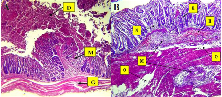 Fig. 4. Histopathological changes in Eimeria tenella infection in poultry. A. Desquamation of epithelial enterocytes lining villi (D), mononuclear cell (M) infiltration in mucosa, and degeneration of muscle fibers 4× H&E. There is marked degeneration (G) muscular smooth fibers (G). B. Clusters of Eimeria at different developmental stages (E) with severe hemorrhage (H). There is heavy infiltration of mononuclear cells (M) with necrosis (N) of the submucosa and severe edema (O) in the submucosa and muscularis: 4× H&E.