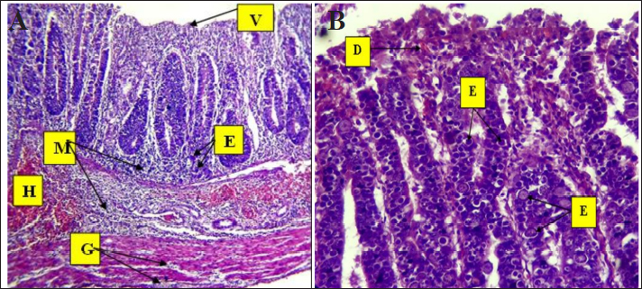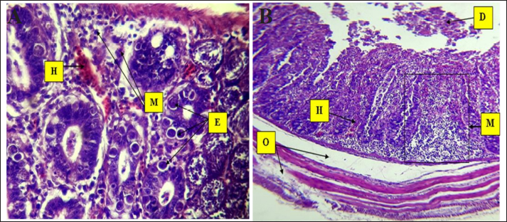 Fig. 6. Histopathological changes in Eimeria tenella infection in poultry. A. Different stages of Eimeria schizonts in the epithelium of crypts and brush borders of villi with severe infiltration of mononuclear cells (mainly eosinophils and macrophages in the submucosa. The infiltration of inflammatory cells (M) and hemorrhage (H) in the submucosa. The clusters of Eimeria at different developmental stages (E) 40× H&E. B. Marked desquamation (D) of epithelial enterocytes lining the villi, loss of villi and epithelial tissue, disruption of the intestinal mucosa, severe degeneration and muscular edema (O), infiltration of inflammatory cells (M) and hemorrhage (H) in the submucosa: 4× H&E.