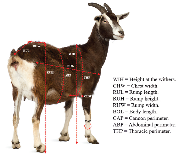 Data were collected from 16 goat farms considering the possibilities of geographical access, support from public institutions, predisposition of goat producers, and availability of transportation. Six phaneroptic variables were recorded on printed sheets: coat color (COC), absence or presence of beard (BER), absence or presence of horns (HOR), teat direction (DOT), correct number of teats (CNT), and absence or presence of wattles (MAM). In the same way, with the support of a zoometric cane and a tape measure, nine morphometric variables were recorded (FAO, 2012): height at the withers (WIH), chest width (CHW), rump length (RUL), rump height (RUH), rump width (RUW), body length (BOL), cannon perimeter (CAP), abdominal perimeter (ABP), and thoracic perimeter (THP) (Fig. 2).