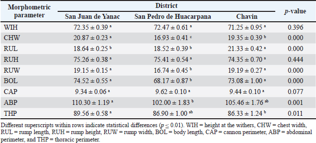 Methods: A total of 146 females aged >2 years without signs of crossbreeding with specialized breeds from the districts of San Juan de Yanac, San Pedro de Huacarpana, and Chavin were evaluated. Six phaneroptic characteristics, nine morphometric characteristics, and nine zoometric indices were registered. Tables and bar graphs were prepared. The chi-square test was performed to determine the association between districts and phaneroptic variables, ANOVA to identify differences between districts, correlation coefficients to evaluate morphostructural harmonicity, and multiple regression analysis to predict the live weight of animals.