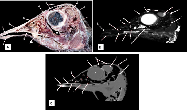 Fig. 3. Sagittal cross section of the adult ostrich head—level 2. A) Photograph of a paramedian sagittal anatomical section (medial view). B) MRI and C) computed tomography images showing: 1- Os premaxillare, 2- Os dentale, 3- Os nasale, 4- Processus. frontalis, 5- Frontal sinus, 6- Os parietale, 7- Os temporalis, 8-Palate, 9- Oral cavity, 10- Tongue, a- Rostral nasal concha, b- Middle nasal concha, c- Caudal nasal concha, d- Dorsal nasal meatus, e- Middle nasal meatus, f- Ventral nasal meatus, g- Infraorbital sinus, h- Orbit containing eye ball, i- Choanal opening and j-Cranial cavity.