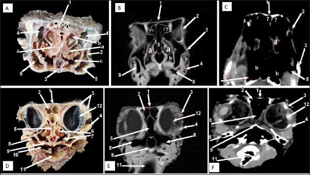 Fig. 6. Rostral-caudal cross sections of the adult ostrich head—level 1. Rostral views of A) photograph of an anatomical cross section, B) MRI and C) computed tomography images (rostral view) showing: a- Rostral nasal concha, b- Dorsal nasal recess, c- Ventral nasal recess, d- Nasal septum. Caudal views of D) an anatomical section photograph, E) MRI and F) computed tomography images showing: 1- Os nasale, 2- Os maxillare, 3- Vomer, 4- Nasal septum, 5- Infra orbital sinus, 6- Frontal sinus, 7- Mandible, 8- Tongue, a- Middle nasal concha (bulla), b- Middle nasal concha, c- Middle nasal meatus, d- Ventral nasal meatus, and e- Rostral nasal concha mucosal fold. Cranium and brainThe ostrich’s cranial cavity was bounded by frontal bone dorsally, basioccipital and basisphenoid bones ventrally, supraoccipital and parietal bones caudally, interorbital septum rostrally, and temporal bone laterally. The parietal, sphenoid, and temporal bones were pneumatic (Figs. 2, 3, 9, and 10). The brain was divided into three parts: the hindbrain (medulla oblongata and cerebellum), the midbrain (cerebrum’s peduncles and optic lobes), and the forebrain (thalamus, pineal body, hypophysis, optic tracts, and chiasm, cerebral hemispheres, and olfactory lobes) (Figs. 2, 9, and 10). The sagittal section of the brain includes the olfactory bulb, cerebrum, cerebellum, medulla oblongata, optic lobe, optic chiasm, and hypophysis (Fig. 2). The dorsal median longitudinal fissure separates the cerebrum into two hemispheres. The sagittal prominence (west) was present on both sides of this fissure (Figs. 9 and 10). The CT pictures revealed the skull as a readily discernible white structure due to its high CT density, while the brain appeared as a grey structure due to its intermediate density. However, the settings utilized made it impossible to identify different areas of the brain in the CT scans (Figs. 9 and 10C, F). The MRI pictures showed the brain as a whitish structure with a high signal intensity. This technique was used to identify various brain structures, including the hindbrain (medulla oblongata, and cerebellum), the midbrain (peduncles of the cerebrum, optic lobes), and the forebrain (thalamus, pineal body, hypophysis, optic tracts and chiasm, cerebral hemispheres, and olfactory lobes) (Figs. 2B, 9 E, and 10E). Additionally, the olfactory bulb, cerebrum, cerebellum, medulla oblongata, optic lobe, optic chiasm, thalamus, and hypophysis. DiscussionThe standard external anatomical features of the ostrich head in this study could effectively help veterinarians diagnose various head disorders in ostriches. Diphtheritic lesions produce pharyngitis and tracheitis, which affect feeding and respiration and cause mortalities in ostriches (ElAbasy et al., 2017; Waziri, M. I. and Saidu, 2022). Also, diseases of the eyes and their muscles adversely influence homeostasis, leading to reproductive disorders, loss in weight, and egg production (Klećkowska-Nawrot et al., 2018). This investigation provides essential anatomical, CT, and MRI data about the nasal cavity of ostrich that will be required in detecting mycotic rhinitis in ostrich. The nasal passages revealed Aspergillus granuloma that was suggested to be occurring owing to inhalation of plant material (Papkoff et al., 1982).