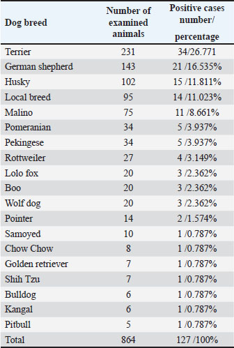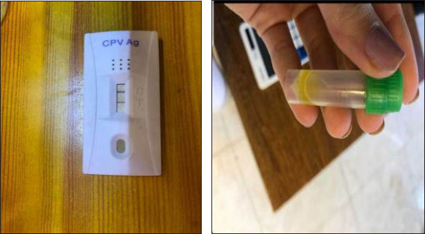 AbstractBackground: Canine parvovirus is the primary etiology of hemorrhagic diarrhea and mortality in puppies worldwide. Aim: This study was designed to investigate canine parvovirus in dogs in Baghdad by rapid testing. Methods: Rectal swabs were collected from 864 dogs presenting at sixteen private veterinary clinics with clinical signs including vomiting, anorexia, nausea, and regurgitation. All dogs were subjected to detailed clinical, physical, and laboratory investigations from early October 2021 until April 2023. Results: A total of 127 dogs were positive for parvovirus using the rapid test. The total infection rate of CPV was 14.69%, with a higher infection rate recorded in dogs less than 6 months and 3 months of age at 44.09% and 41.73%, respectively. A significant infection rate was reported in male dogs compared with female dogs, and the Terrier breed showed a higher infection rate than the other breeds included in this study. Fever was present in 78.33% of infected dogs as well as another clinical signs related to CPV infection. The infection rate was 71.65% in vaccinated dogs and 28.35% in unvaccinated dogs. After the treatment steps, 87.4% of the infected dogs recovered, and 12.6% of the infected dogs died. Conclusion: CPV is circulating in dogs in Baghdad city, and unvaccinated dogs younger than 6 months were most susceptible to the virus. Keywords: Parvovirus, Canine, Rapid test, Infection rate, Baghdad. IntroductionCanine parvovirus is a small DNA virus, which is a nonenveloped with a single-strand genome that is included in the Parvoviridae family (Mia and Hasan, 2021). There are two types of parvovirus that infect canines: CPV-1 or the minute virus of canine and CPV-2. Canine parvovirus-2 is dominant in Belgium, Japan, Australia, and the United States and is later recorded worldwide (Tuteja et al., 2022). Parvovirus is highly resistant to many disinfectants and is susceptible to halogen disinfectants, for example, sodium hypochlorite, which is commonly used for decontamination in veterinary clinics and pet animal housing facilities because of its broad-spectrum activity (Cavalli, et al., 2018). The predisposing factors to parvovirus infections in puppies are lack of protective immunity, internal parasites, unsanitary conditions, overcrowded conditions, and environmental stressful conditions (Khare, et al., 2020). Canine parvovirus infection transmitted by fecal–oral method via contact with contaminated animal feces or contaminated surfaces of infected dogs (Mia and Hasan, 2021). The winter season, small age, nonvaccination, local breed, and male sex were recorded as much higher risk factors for canine parvovirus enteritis in Bangladesh. (Nizami et al., 2020). The parvovirus infection causes high morbidity, reaching 100% in 10% of adult dogs and 90% in puppies (Pandya et al., 2017), regardless of the vaccination against canine parvovirus-2 strains; the infection remains a significant economic and veterinary concern. (Mazzaferro, 2020). The first report of canine parvovirus infection in Iraq was published in 2010 (Al-Bayati et al., 2010), and molecular detection was conducted in 2012 (Ahmed et al., 2012). This study aimed to investigate the infection rate of parvovirus disease in dogs in Baghdad, Iraq. Materials and MethodsStudy area and designDuring the period from early October 2021 to April 2023, a survey was conducted of 864 dogs in sixteen veterinary clinics located in Baghdad city, and data were collected from cases of dogs with clinical signs referred to as gastrointestinal disturbances. Data and samplesA total of 864 dogs presented to private veterinary clinics were examined with a history of vomiting, anorexia, nausea, or regurgitation and were selected and underwent detailed clinical, physical examinations and laboratory investigations. Data from every case were recorded in questionnaire including breed, age, sex, vaccination status, and details and the protocols of treatments used. A general examination was performed, including temperature, pulse, and respiration. Fecal swabs were taken to examine using the rapid monoclonal antibody test kit (Rohi Biotechnology test kit) (Fig. 1). The inclusion criteria for this study of all dogs showed gastrointestinal disturbance signs and the exclusion criteria included healthy animals. ResultsThe total infection rate was found in 14.69% (127/864) of tested dogs by the rapid monoclonal antibody test (Fig. 2). Depending on the infected breeds distribution, the results showed that the infection rate of CPV in the Terrier breed was a higher percentage of infection (26.771%), while the lowest infection rate of breeds was in Samoyed, Chow, Golden retriever, Shih Tzu, Bulldog, Kangal, and Pit bull (0.787%) (Table 1). The results also revealed that a higher infection rate was recorded in dogs less than 6 months 44.09%, while a low infection rate was recorded in dogs aged more than 6 months 8.66% (Table 2); a high infection rate in canine parvovirus 48.7% has been found in dogs aged between 1 and 3 months in comparison with 4 and 6 months 17.2% and older than 6 months dogs at 8.3%. In the present study, the number of dogs with signs of canine parvovirus was significantly higher in male dogs 65.355% compared with female dogs 34.645% (Table 3). Depending on the clinical signs, 78.33% of the infected dogs experienced fever, 33.33% suffered from diarrhea, 61.66% suffered from bloody diarrhea, 58.33% suffered from vomiting, and 65% of the infected dogs suffered from dehydration (Figs. 3 and 4), (Table 4). The total infection rate of canine parvovirus in the current study was 71.65% in vaccinated dogs and 28.35% in unvaccinated dogs (Table 5). Our study also recorded that 87.4% of infected dogs recovered after treatment, and 12.6% of infected dogs died (Table 6). DiscussionThere are several ways to detect the antigen of the parvovirus in dog feces, such as using antigen rapid test kits, which enable the antibodies parvovirus specific t