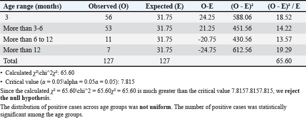 The infection rate in male dogs were higher than female dogs which in lined with previous studies of Gombak et al., (2008) and Thomas et al., (2014), who recorded a significant infection rate of canine parvovirus in 78.26% of male dogs. The male sex infection preference might be because of the greater exposure chance of them to parvovirus loads by their behavior, especially roaming and territorial behavior, which is also mentioned by Deka et al., (2013). The rearing of males rather than females may be another cause of the high rate of CPV infection. The main pathogenesis of canine parvovirus infection is virus-induced rapid dividing cell destruction, involving gastrointestinal epithelial cell crypts, lymph nodes, thymus, and precursor cells of bone marrow. This leads to disruption of the intestinal mucosal barrier, atrophy of villi, and malabsorption, as well as leukopenia (especially neutropenia and / or lymphopenia), leading to vomiting, severe diarrhea, and dehydration (Kalli et al., 2010; Greene, 2012). A finding similar to our study results was also reported by Mylonakis et al. (2016) and Bhattacharjee et al. (2021). Table 2. Distribution of positive cases according to age.