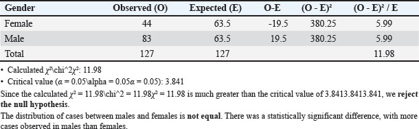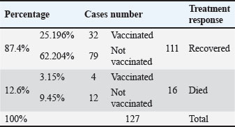 The possible causes of the occurrence of canine parvovirus in vaccinated dogs are primary dose administration alone, delayed booster vaccination, lack of awareness regarding vaccination, and affordability of pet owners (Geetha and Selvaraju, 2021). Table 6. Distribution of recovered cases and died cases.