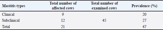 Table 2. Prevalence of mastitis in dairy cows at Guranteng Dairy Farm.