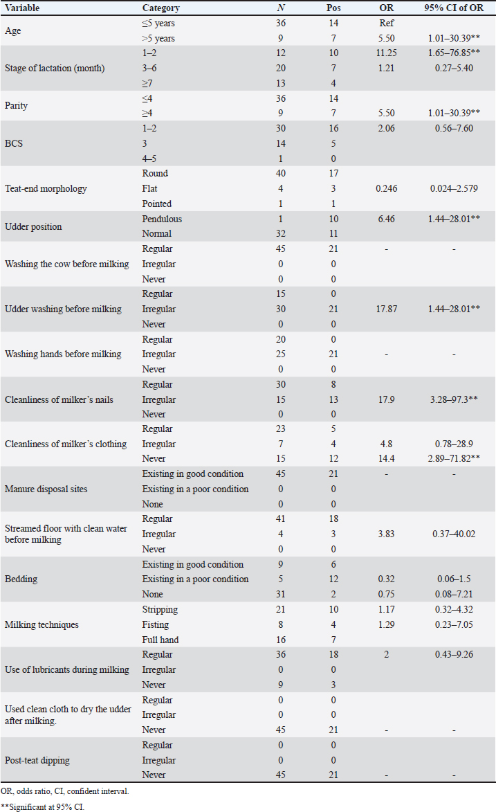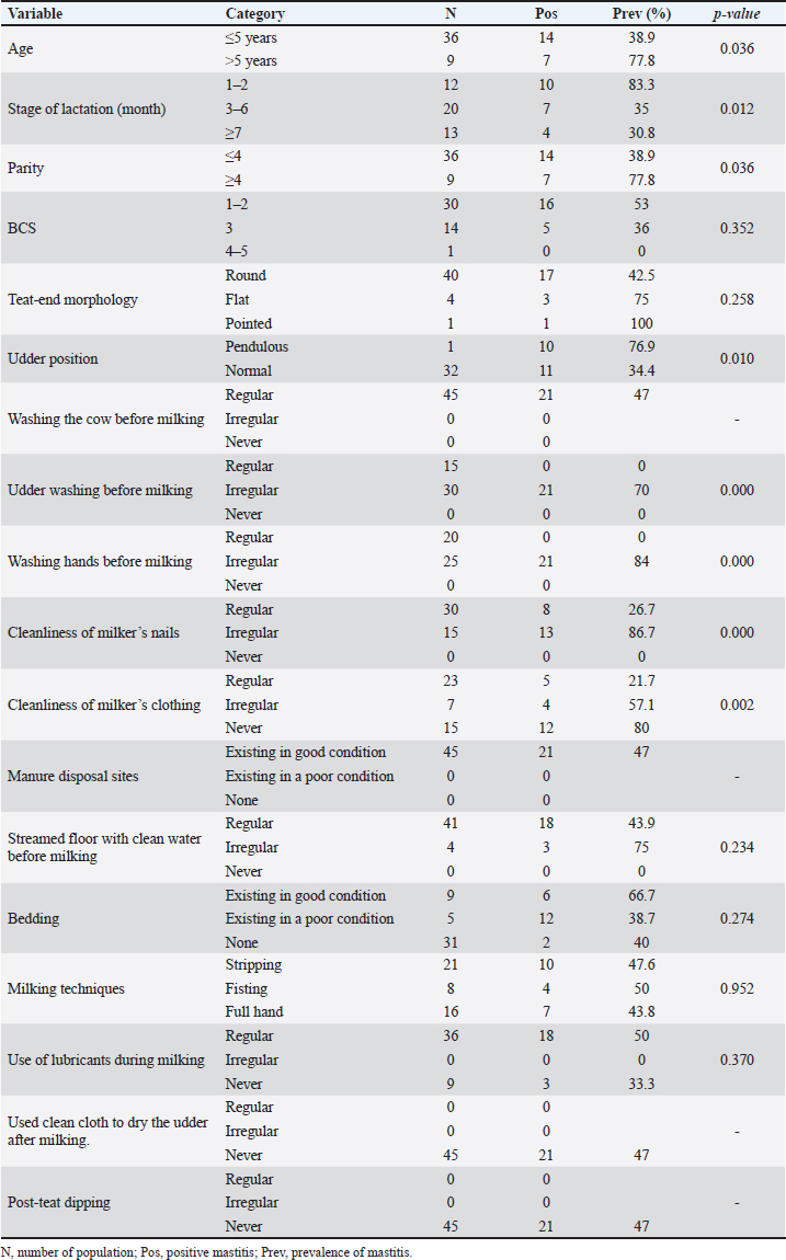 Ethical approvalThis study was approved by the Research Ethics Commission of the Faculty of Medicine, Universitas Padjadjaran Indonesia with registration number: 2202010268 and ethical exemption number: 282/UN6.KEP/EC/2022. ResultsPrevalence of mastitis in the Guranteng Dairy FarmThe results of this study showed that 21 out of 45 cows examined were affected by mastitis, indicating an overall prevalence of 47% at Guranteng Dairy Farm (Table 2). Among the 45 lactating cows assessed for udder condition, nine cows (20%) were diagnosed with clinical mastitis, while 12 cows (27%) were identified with subclinical mastitis based on the CMT screening (Figure 1). Risk factors for mastitis at Guranteng Dairy FarmThe results of the Chi-Square analysis indicated a statistically significant correlation (p ≤ 0.05) between the prevalence of mastitis at Guranteng Dairy Farm and several factors, including cow age (p=0.036), stage of lactation (p=0.012), parity (p=0.036), udder position (p=0.010), udder washing before milking (p=0.000), washing hand before milking (p=0.000), cleanliness of milker’s nail (p=0.000), and cleanliness of milker’s clothing (p=0.002). The remaining variables, including BCS (p=0.352), teat end morphology (p=0.258), washing cow before milking, manure disposal sites, streamed floor with clean water before milking (p=0.234), bedding (p=0.274), milking technique (p=0.952), using udder lubricant during milking (p=0.370), using a clean cloth to dry udder after milking, and post teat dipping were not found to have a significant correlation with the incidence of mastitis in Guranteng Dairy Farm (Table 3). The results of the bivariate analysis with logistic regression showed that the age of cows in the category above 5 years had an odds ratio (OR) value=5.5 (CI 95% 1.01–30.39), which indicates that cows aged above 5 years have a chance of developing mastitis 5.5 times greater than cows under 5 years old. The stage of lactation of 1–2 months category had an OR value of 11.25 (CI 95% 1.65–76.85), which means that cows with a stage of lactation of 1–2 months have an 11.25 times greater risk of developing mastitis than cows with a stage of lactation of 3–6 months, and ≥7 months. The parity category of cows that calved up to four times showed an OR of 5.5 (95% CI 1.01–30.39), indicating that these cows have a 5.5 times greater chance of developing mastitis compared to cows that calved fewer than four times. The pendulous udder position category had an OR value of 6.4 (CI 95% 1.44–28.01) indicating that cows with pendulous udders had a 6.4 times greater risk of developing mastitis than cows with non-pendulous udders. The cleanliness of milker’s nails had an OR=17.9 (CI 95% 3.28–97.3) indicating that milkers who do not regularly ensure short and clean nails before milking have a risk of causing their cows to develop mastitis. This risk is 17.9 times greater than that of milkers who regularly ensure short and clean nails before milking. The cleanliness of milkers’ clothing during milking for the never category had an OR value=14.4 (95% CI 2.89–71.82) indicating that milkers who never wear clean clothing during milking have a risk of causing their cows to develop mastitis 14.4 times greater than milkers who regularly wear clean clothing during milking (Table 4). DiscussionIn this study, it was found that there was a significant correlation between the prevalence of mastitis in the dairy cows of Guranteng Dairy Farm and the age of the cow. The results of this study are consistent with the findings of Mungube et al. (2004), who suggested that age is a risk factor for mastitis. Younger cows are less susceptible to infection through more effective defense mechanisms than older cows (Tuke et al., 2017). According to Subronto (2003). The older the cow, the higher the tendency of the teat sphincter to widen. The sphincter plays a role in limiting the entry of microorganisms into the udder (Kumar et al., 2020), so the possibility of microorganisms entering the udder and causing infection will increase. In addition, cows older than five years tend to have pendulous udders and a history of mastitis (Kocak, 2006). The present study also revealed a significant correlation between pendulous udders and the prevalence of mastitis in Guranteng. Pendulous udders are particularly susceptible to mastitis because of the increased likelihood of pathogens adhering to the teat and gaining access to udder tissue. Cows that have calved up to four times are generally more prone to pendulous udder conditions, thereby increasing the risk of developing mastitis (Kocak, 2006). This study further confirmed that parity has a significant influence on the prevalence of mastitis in dairy cows at Guranteng Dairy Farms. Furthermore, this could potentially result from multiple parity, thereby causing damage to the milking area and significantly increasing the risk of udder infection by pathogenic bacteria (Chen et al., 2023). Table 3. Chi-square analysis of the correlation between risk factors and the incidence of mastitis in Guranteng Dairy Farm, Tasikmalaya.